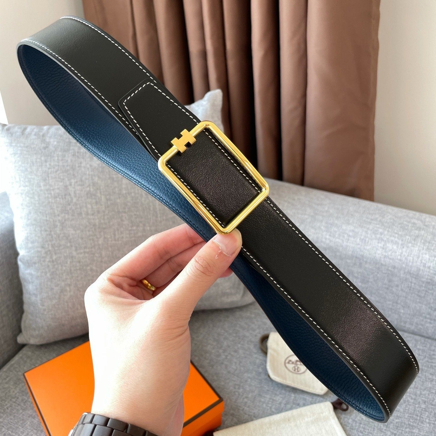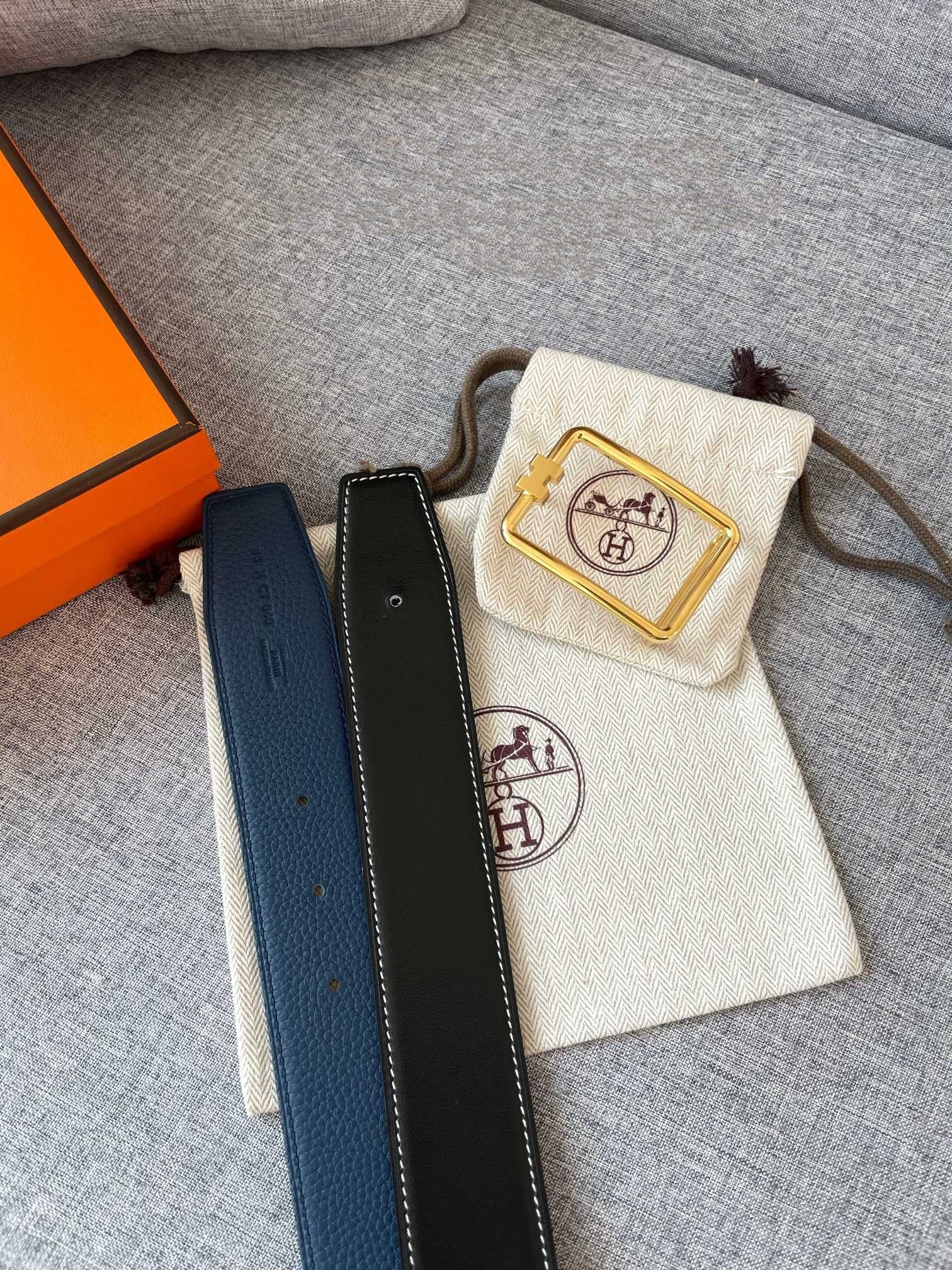 H TUBE BELT 38MM GOLD BUCKLE BLUE BLACK LEATHER