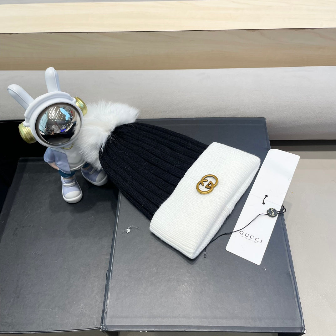 BEANIE HAT IN BLACK MIX WHITE WOOL AND FOX FUR 422524