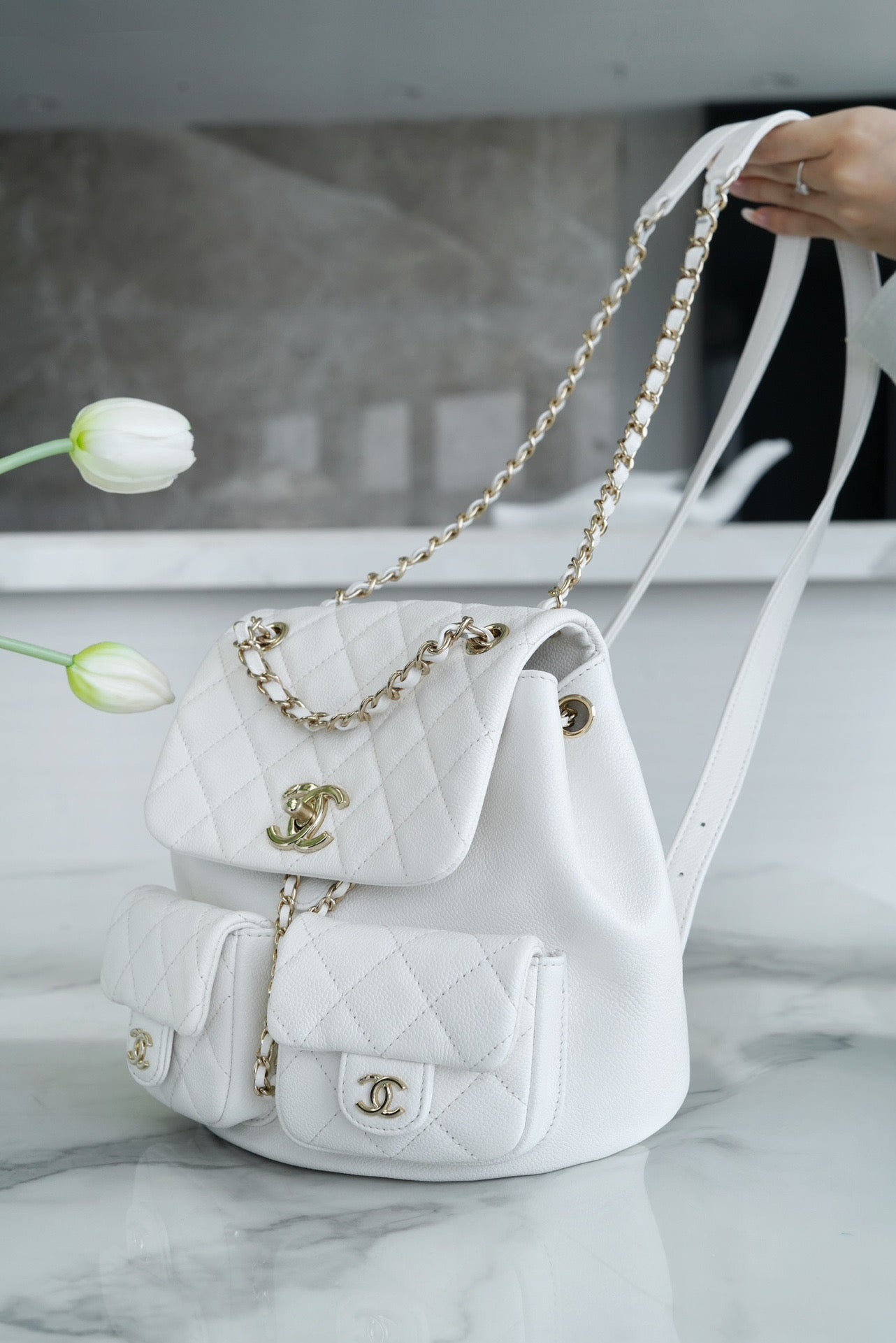 EXTRA POCKET BACKPACK L23.5 IN WHITE CANVAS AND BRONZE BROWN CALFSKIN