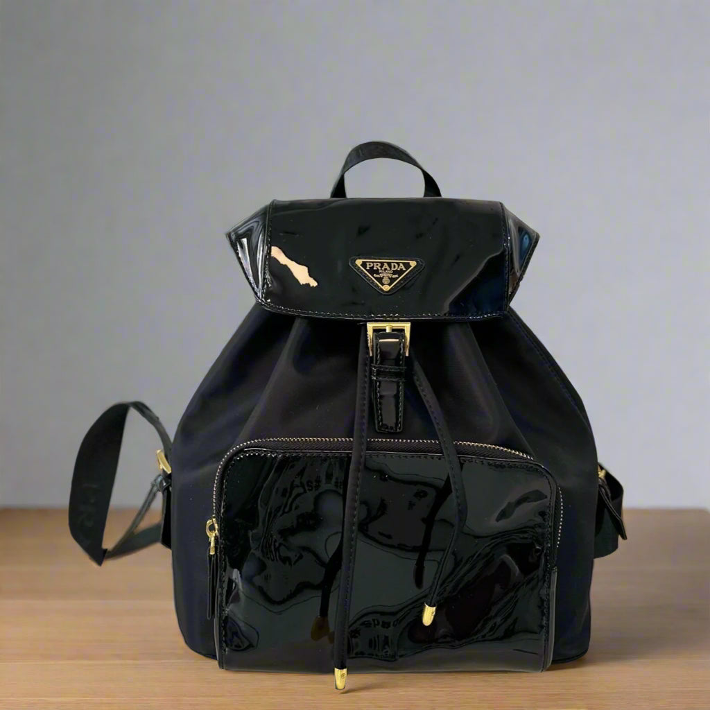 BACKPACK 30 IN BLACK RE-NYLON AND PATENT CALFSKIN GOLD HARDWARE