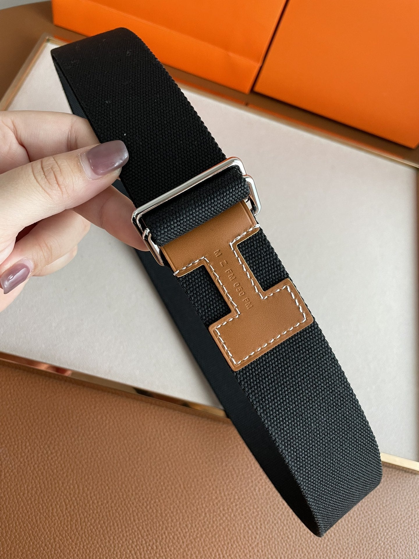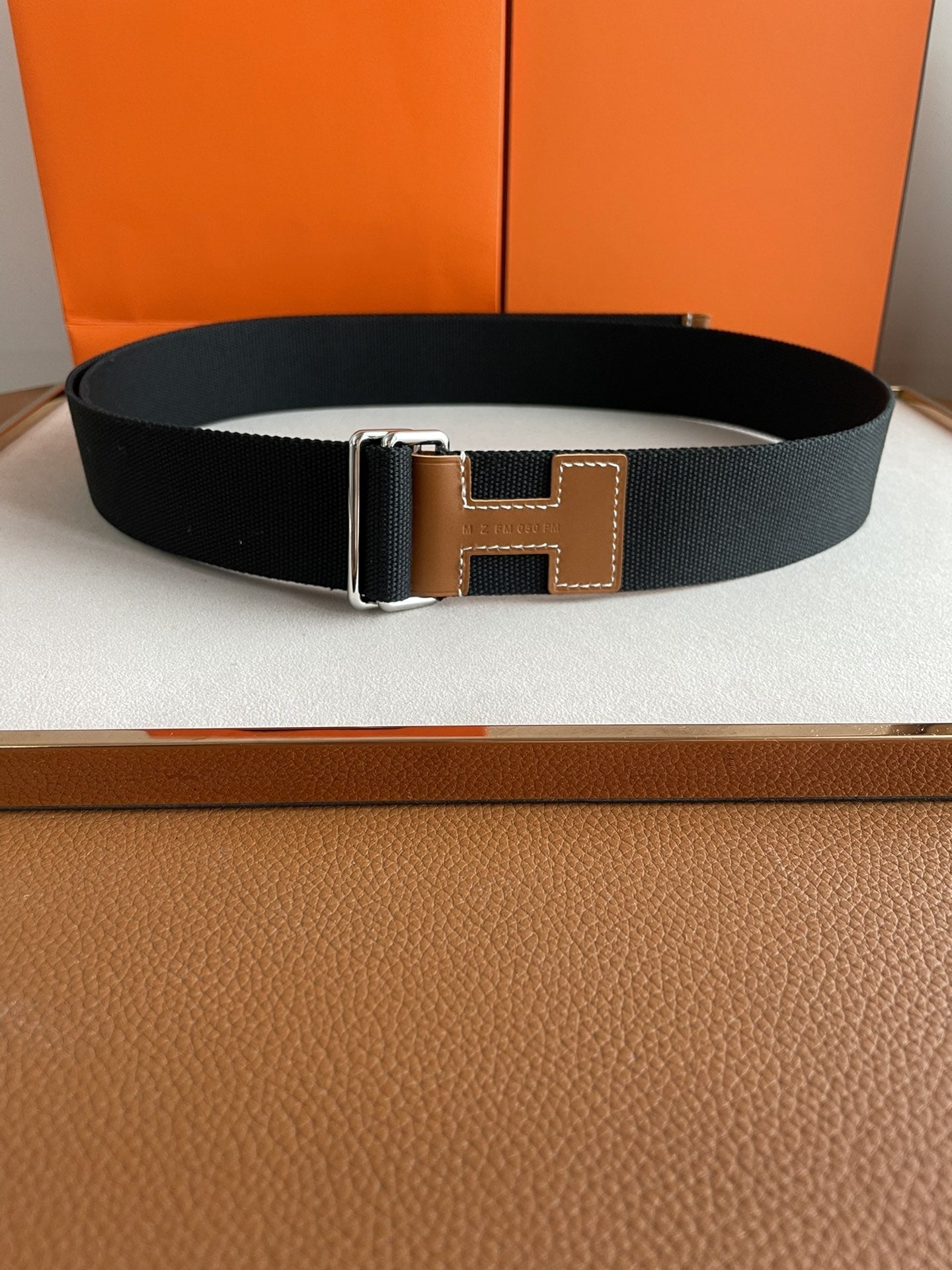 • H Buckle in permabrass plated metal.