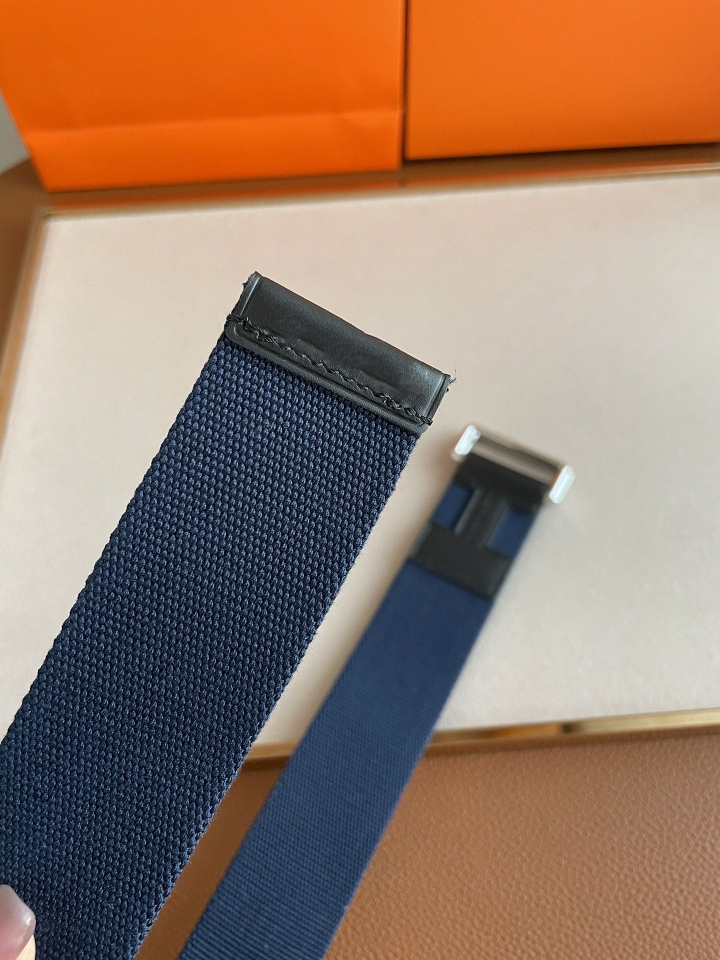 • H Buckle in permabrass plated metal.