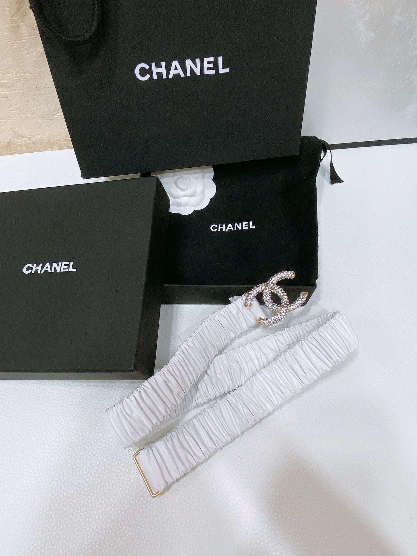 • CC ELASTIC BELT 30MM IN WHITE CALFSKIN GOLD HARDWARE WITH RHINSTONES