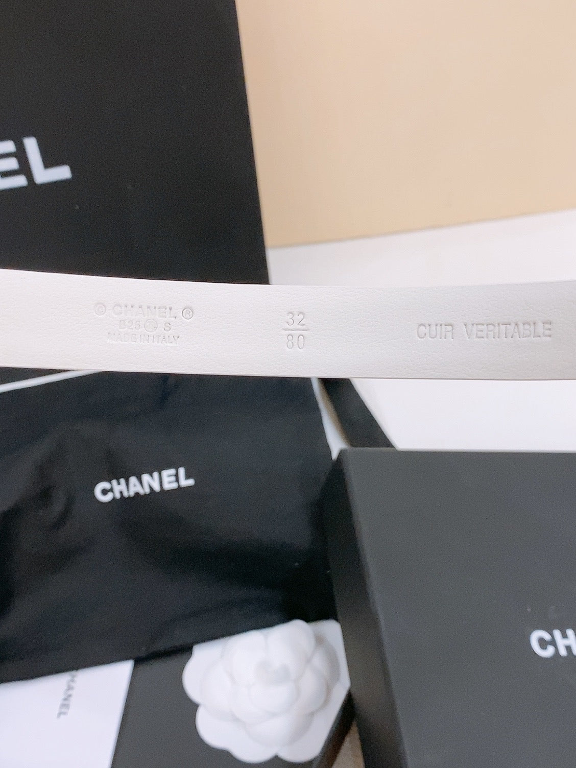 • DOUBLE C BELT 20MM IN WHITE CALFSKIN WITH GOLD CHAIN INTERWOVEN BUCKLE