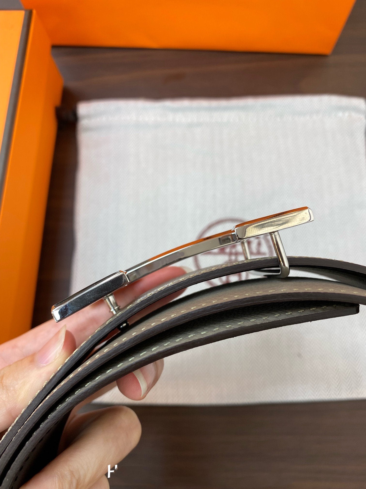 • H Buckle in permabrass plated metal.