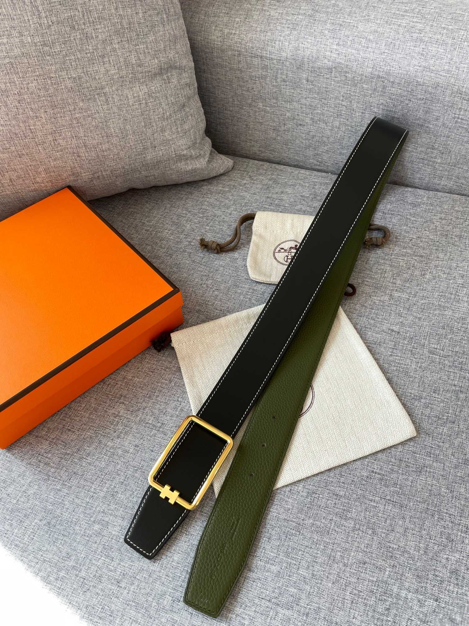 • H TUBE BELT 38MM GOLD BUCKLE GREEN BLACK LEATHER