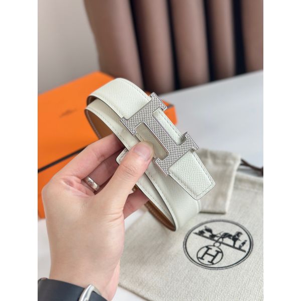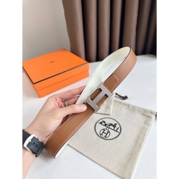 • HERM H Guillochee Reversible Belt 32MM in Gold and White Epsom Calfskin