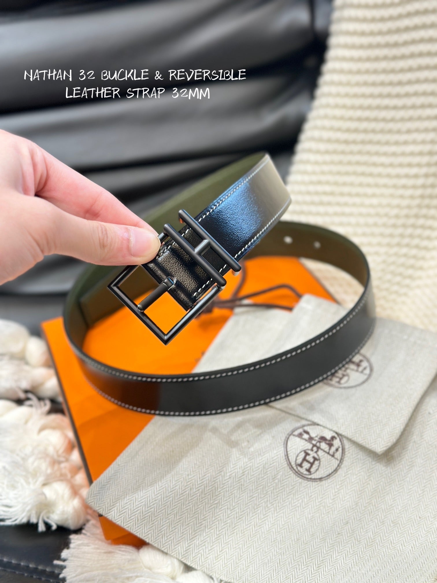 • HM NATHAN REVERSIBLE BELT 32MM OLIVE GREEN AND BLACK LEATHER BLACK HARDWARE