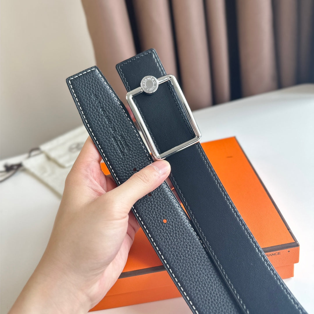 • HM OSCAR BELT BUCKLE & REVERSIBLE BLACK LEATHER STRAP 38MM SILVER HARDWARE