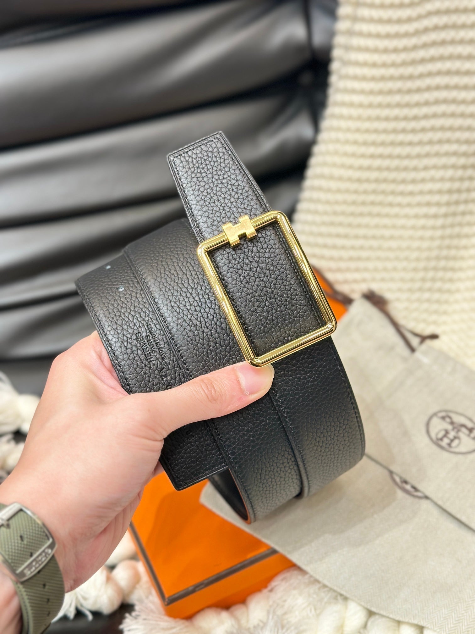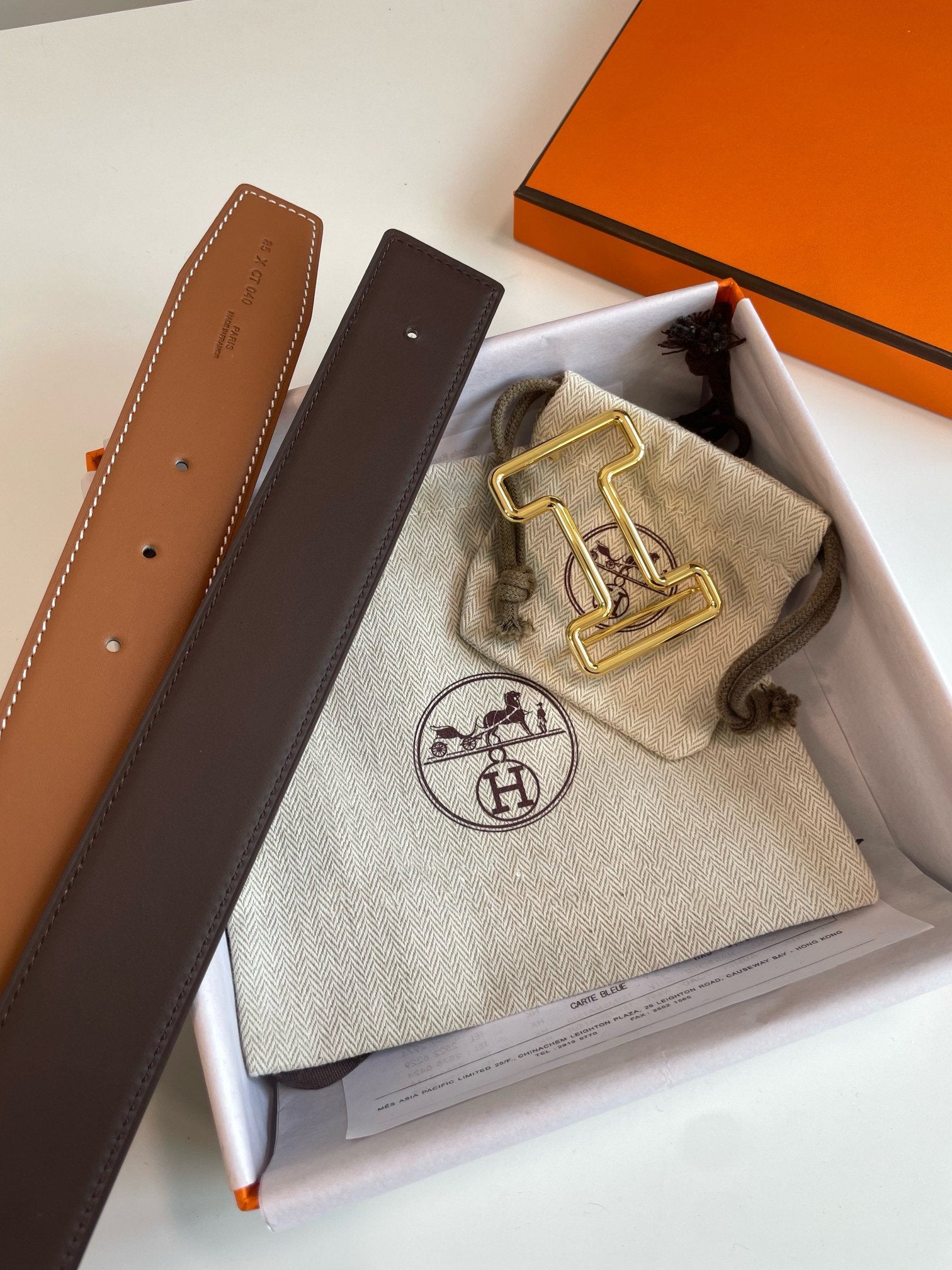 HM TUBE H BELT GOLD BUCKLE & REVERSIBLE BLACK LEATHER STRAP 38MM