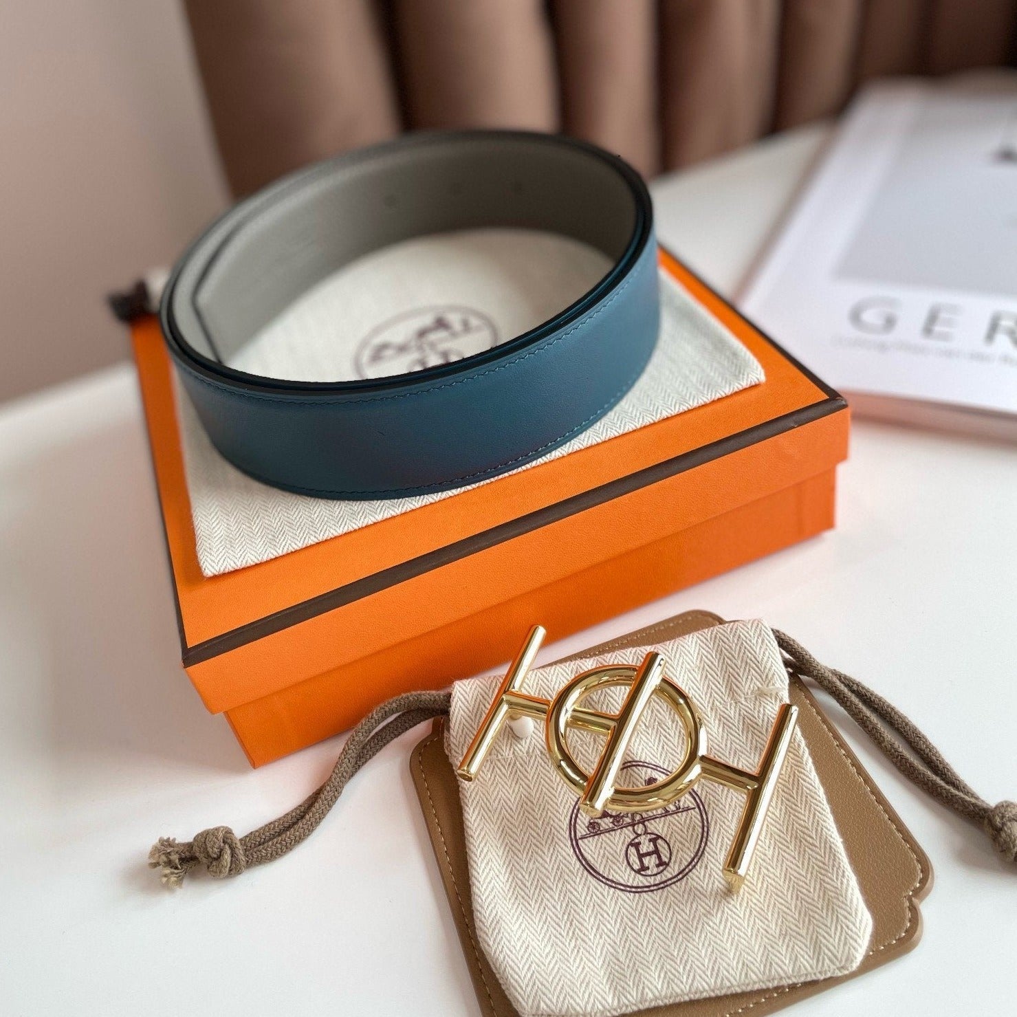 HM TUBE H BELT GOLD BUCKLE & REVERSIBLE HONEY ORANGE LEATHER STRAP 38MM
