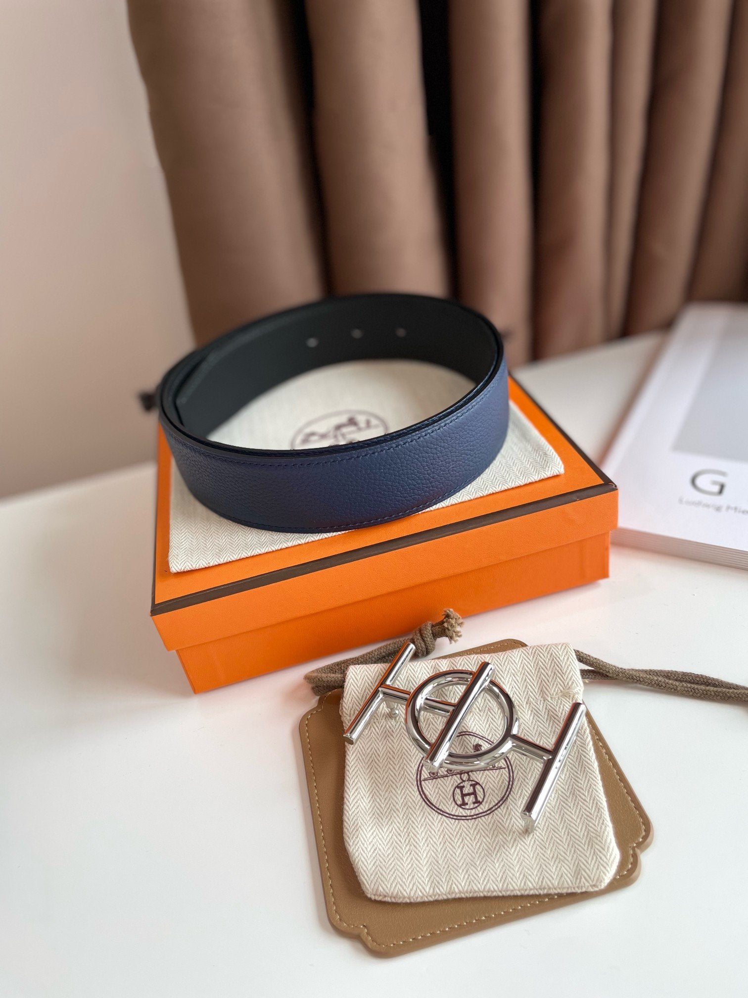 HM TUBE H BELT BUCKLE & REVERSIBLE BLACK AND AEGEAN BLUE LEATHER STRAP 38MM GOLD HARDWARE