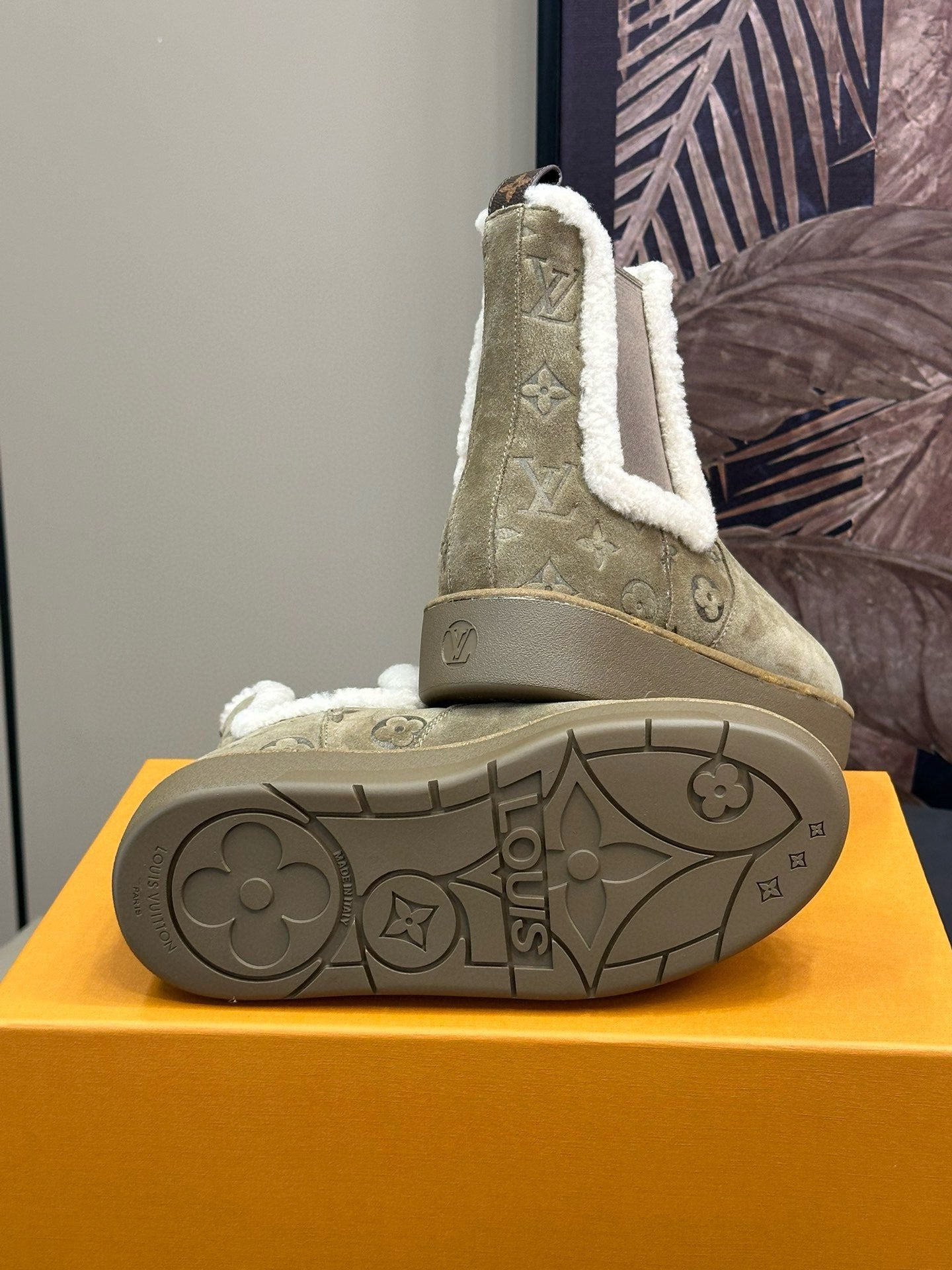 • Material: Monogram-debossed suede calf leather, Shearling lining