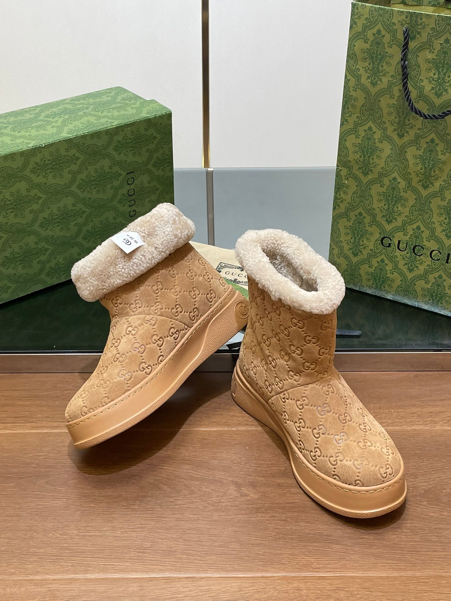 • Material: Embossed suede with beige wool lining