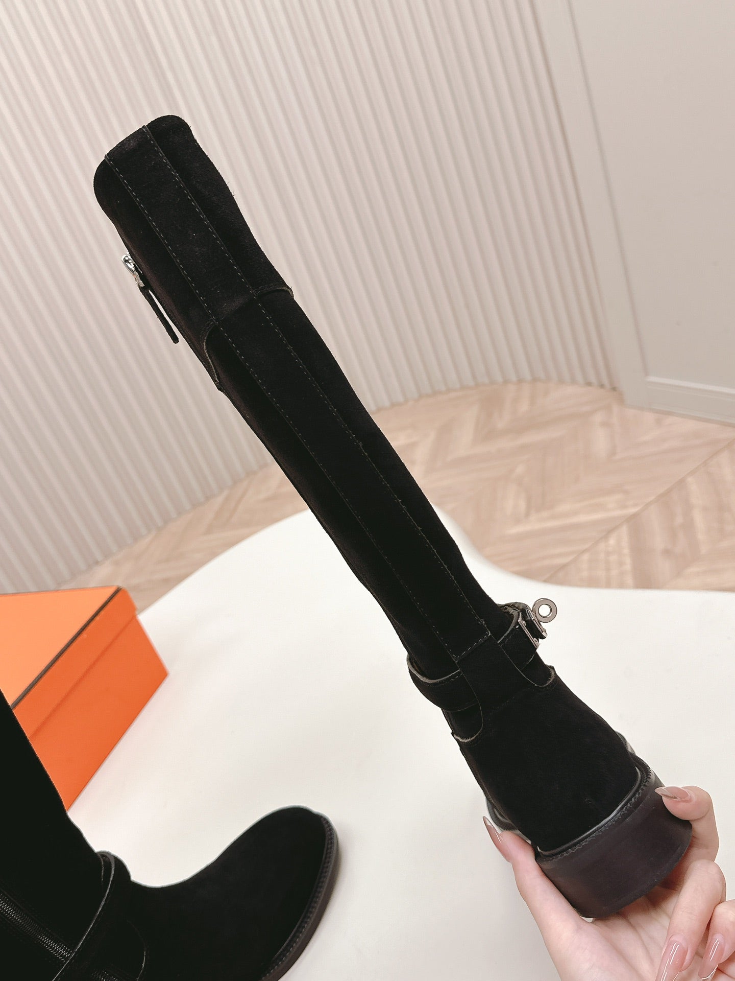 KNEE HIGH BOOTS IN BLACK SUEDE WITH SILVER BUCKLE