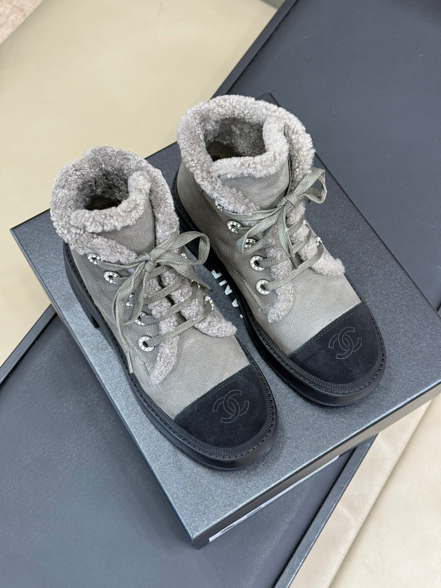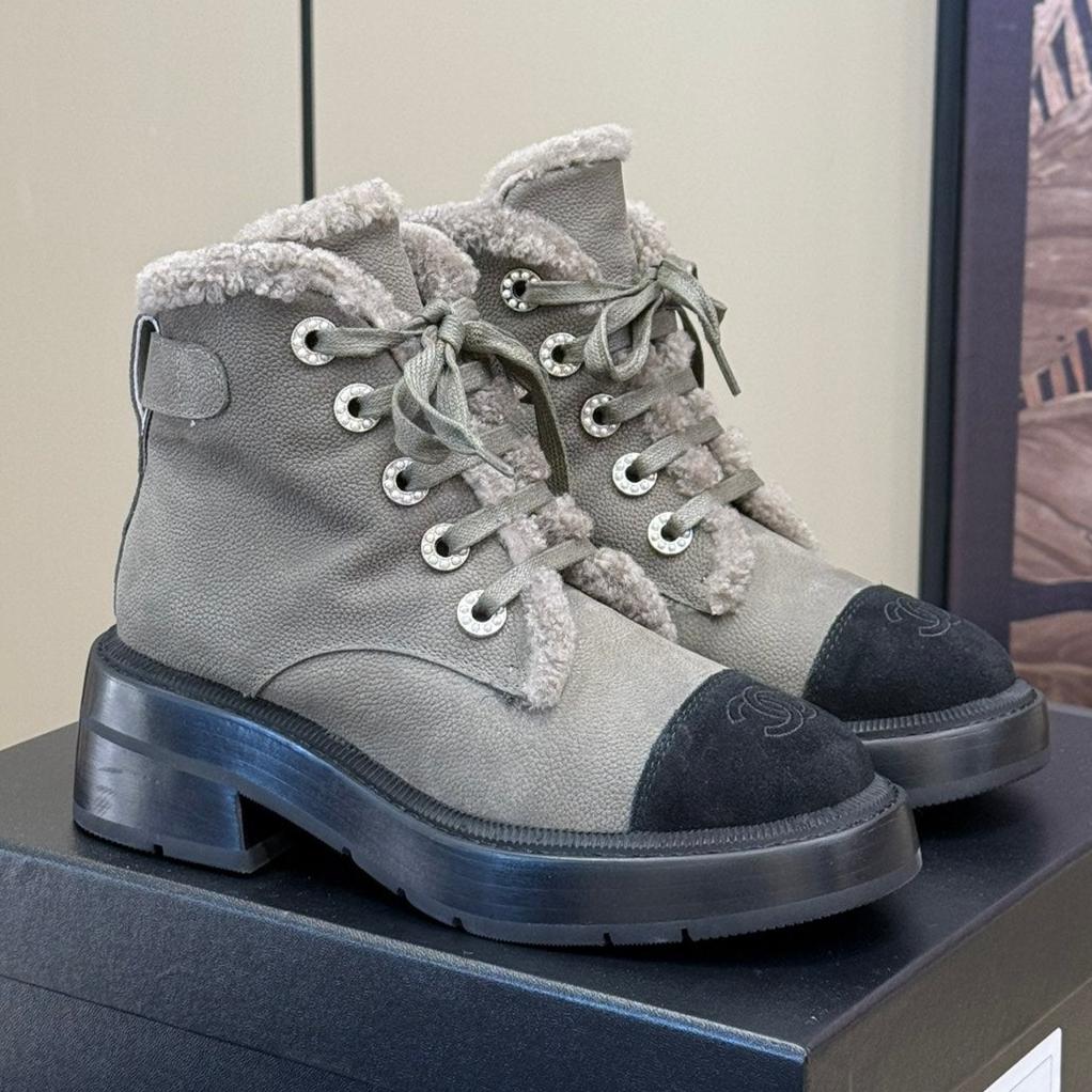 SUEDE BOOTS SLATE GRAY WITH SHEARLING LINING AND RUBBER FLATFORM SOLE