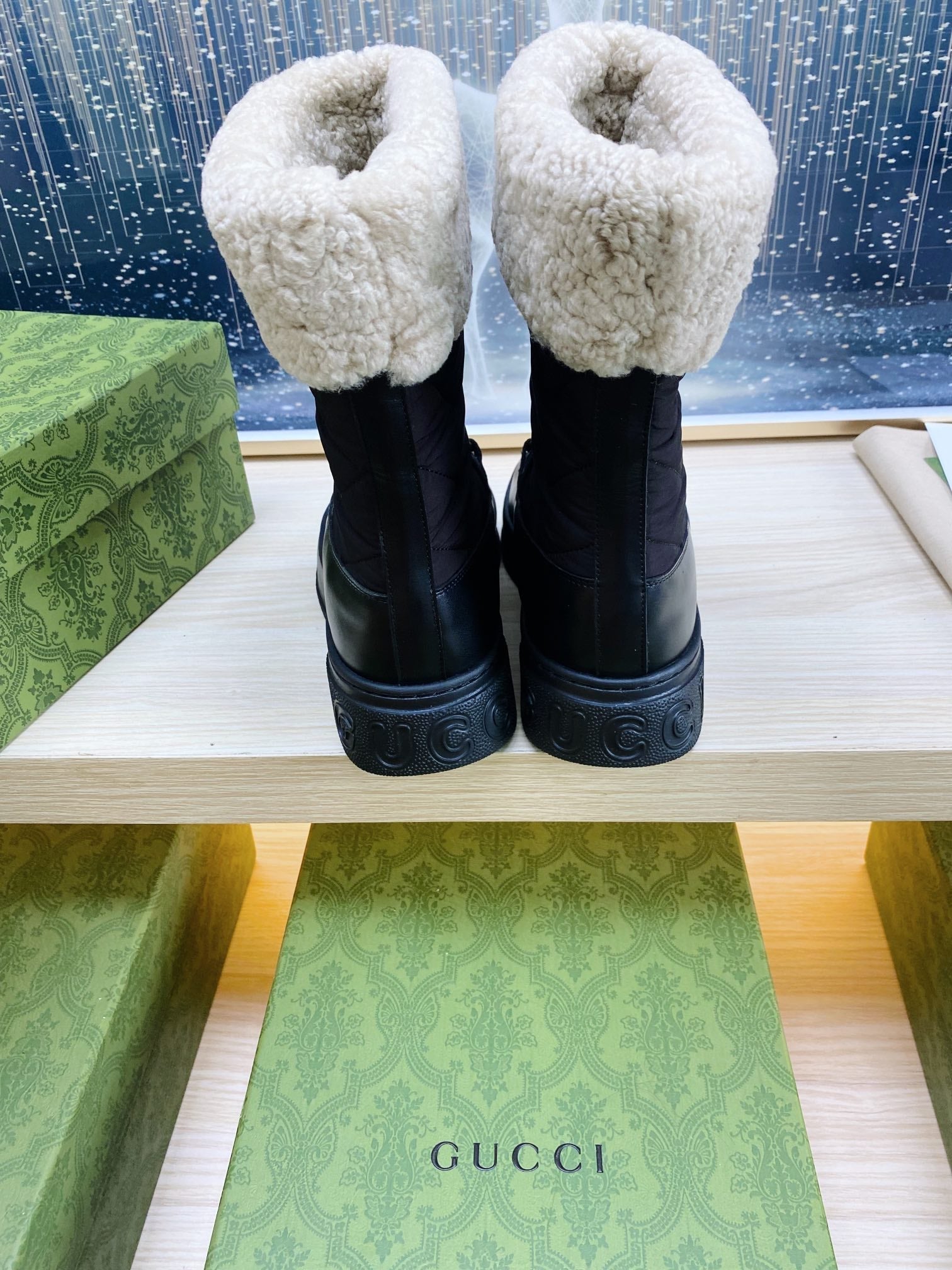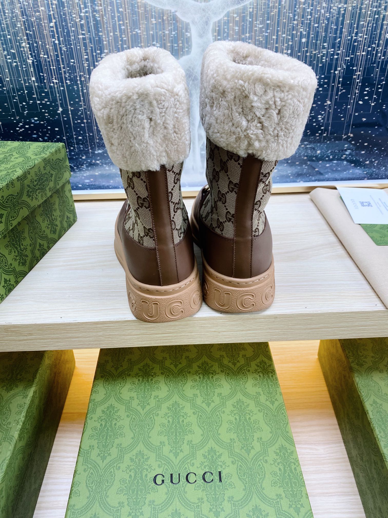 GG SNOW BOOTS IN CIDER BROWN EMBOSSED SUEDE AND BEIGE WOOL LINING
