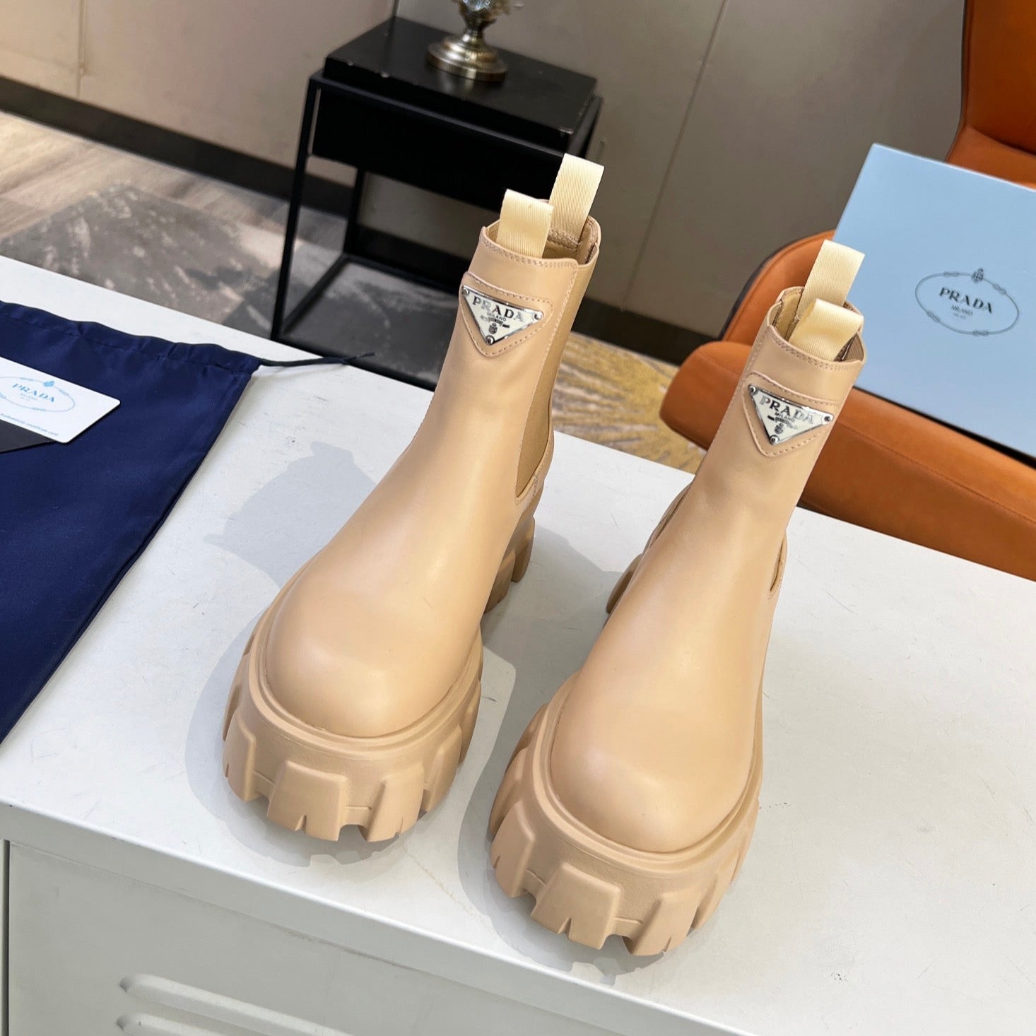 PRA MONOLITH BRUSHED AND RE-NYLON BOOTS WITH POUCH BEIGE CALFSKIN