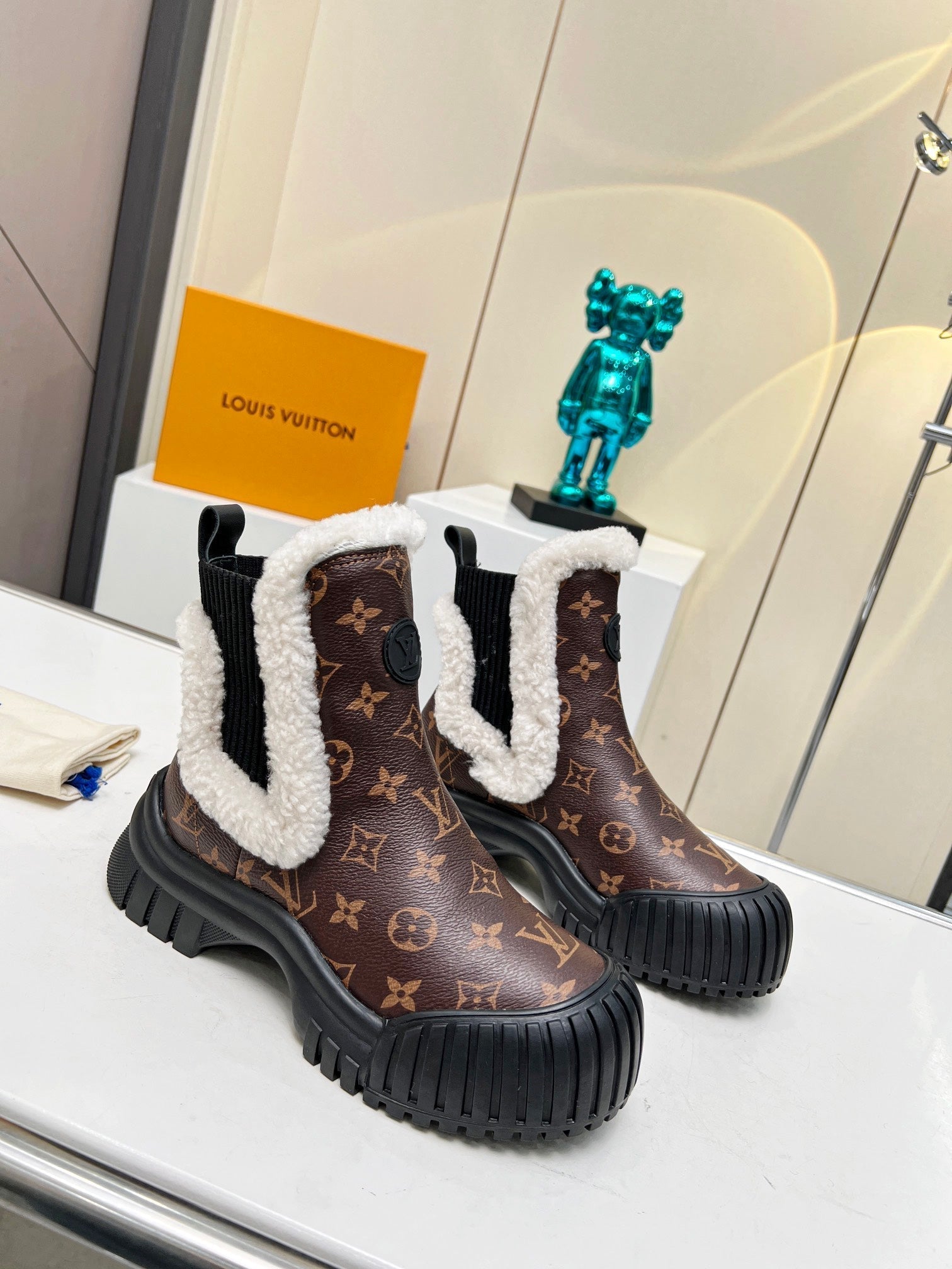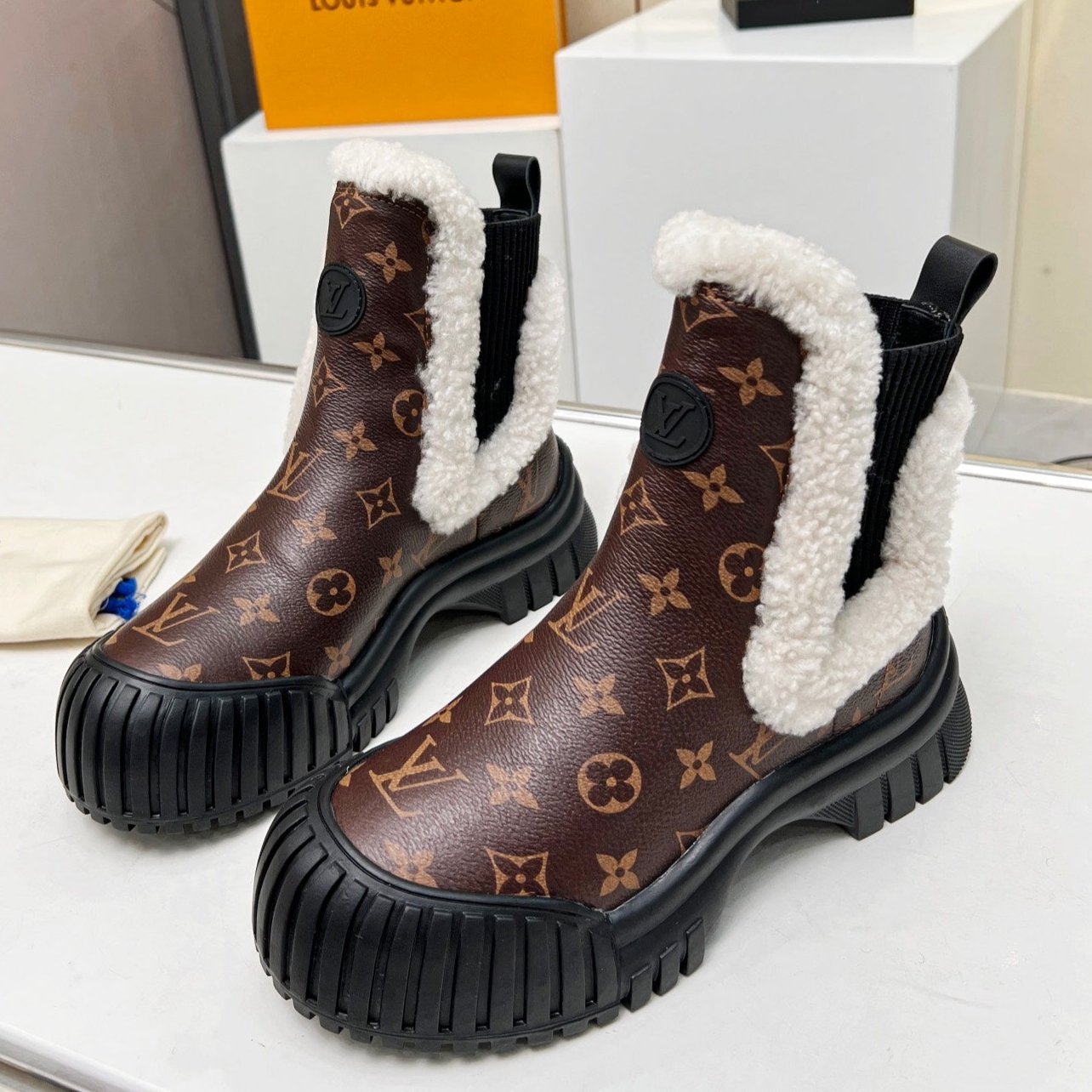 LV RUBY FLAT ANKLE BOOT IN CHOCOLATE BROWN MONOGRAM CALFSKIN AND WHITE SHEARLING