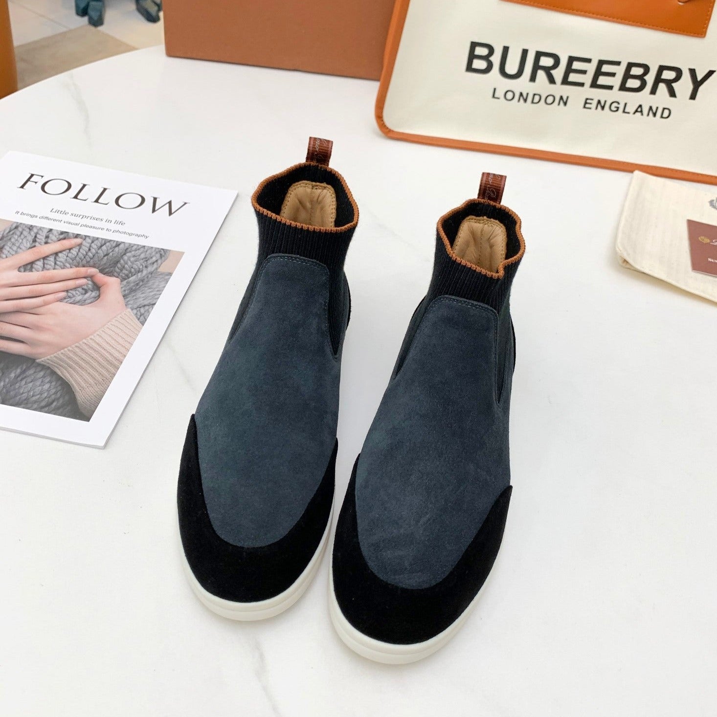 LAUREATE PLATFORM BOOTS IN BLACK SUEDE AND NAVY BLUE MONOGRAM JACQUARD PATTERN