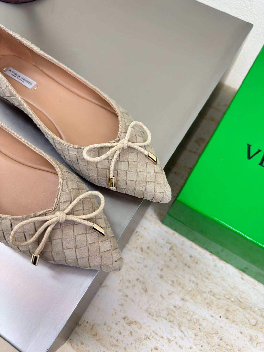 BALLET FLAT IN LIGHT BROWN INTRECCIATO SUEDE WITH BOW