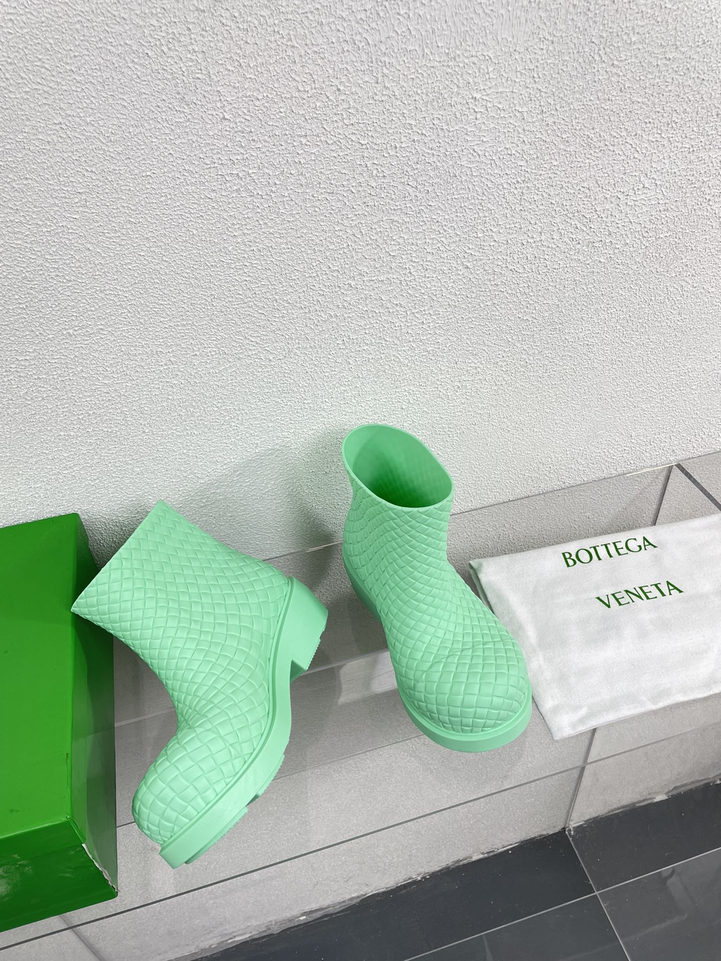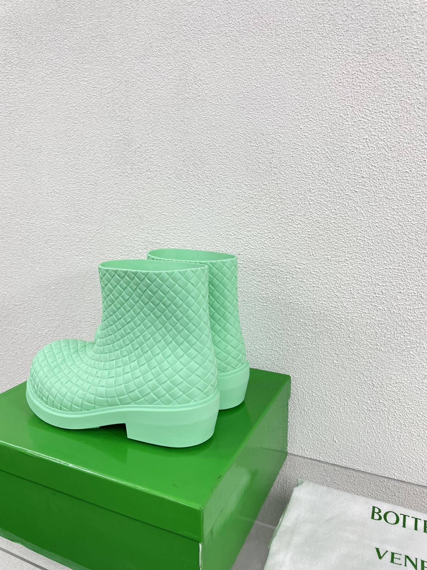 FIREMAN BOOTS IN GREEN MINT RUBBER WITH ICONIC INTRECCIO MOTIF