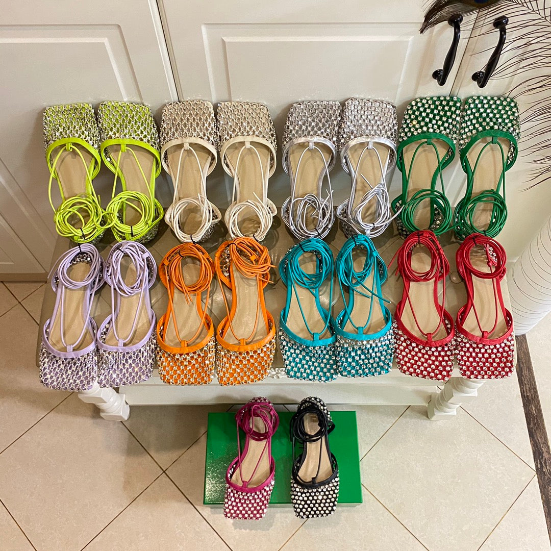 LACE-UP FLAT SANDAL IN LIGHT PURPLE METALLIZED MESH AND LEATHER WITH RHINSTONES