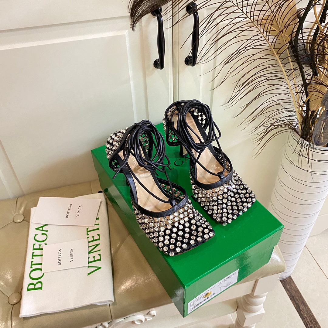 LACE-UP SANDAL IN BLACK METALLIZED MESH AND LEATHER WITH RHINSTONES 9 CM