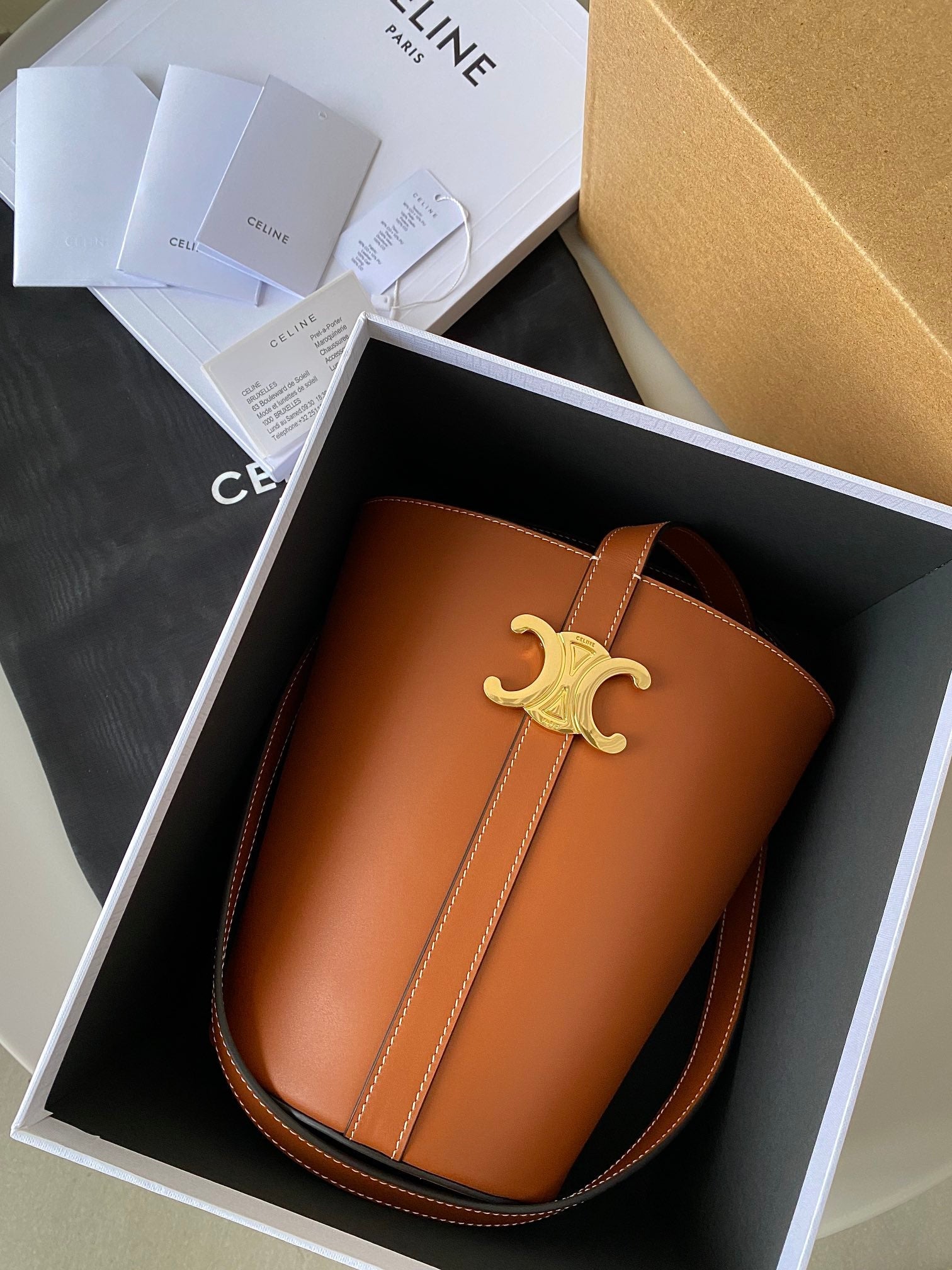 TRIOMPHE 25 BUCKET BAG CINNAMON BROWN CALFSKIN