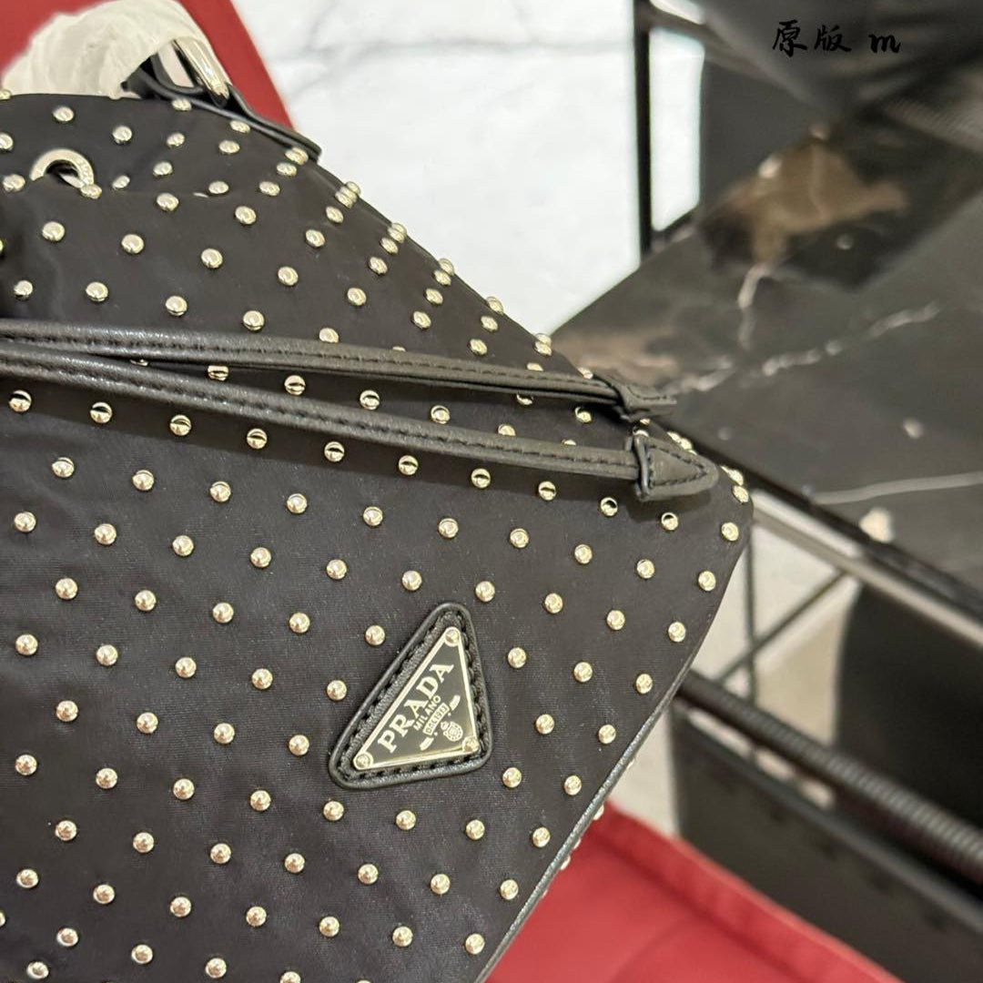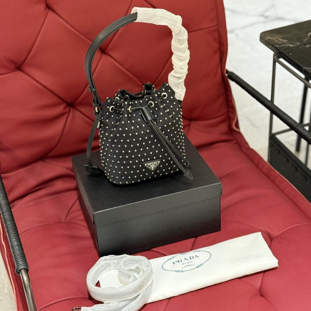 STUDDED BUCKET BAG 19 IN BLACK RE-NYLON MIX CALFSKIN