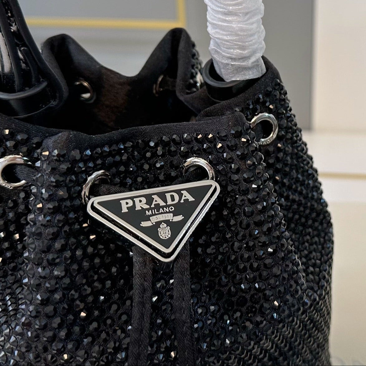 STUDDED DRAWSTRING BUCKET BAG 20 IN BLACK RE-NYLON MIX CALFSKIN