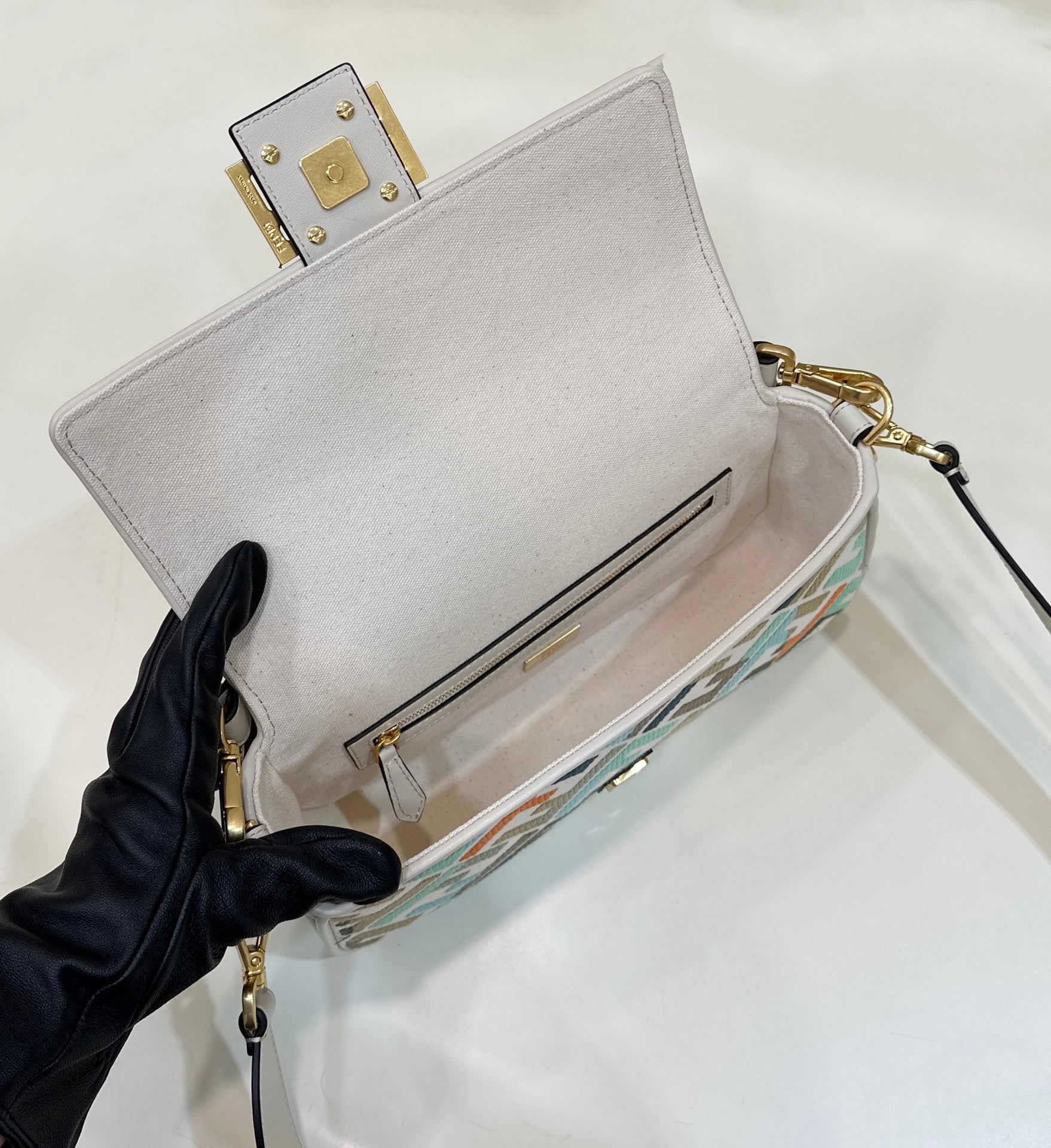 BAGUETTE CANVAS 27 BAG WHITE STRAP WITH MULTICOLOUR EMBROIDERY GOLD HARDWARE
