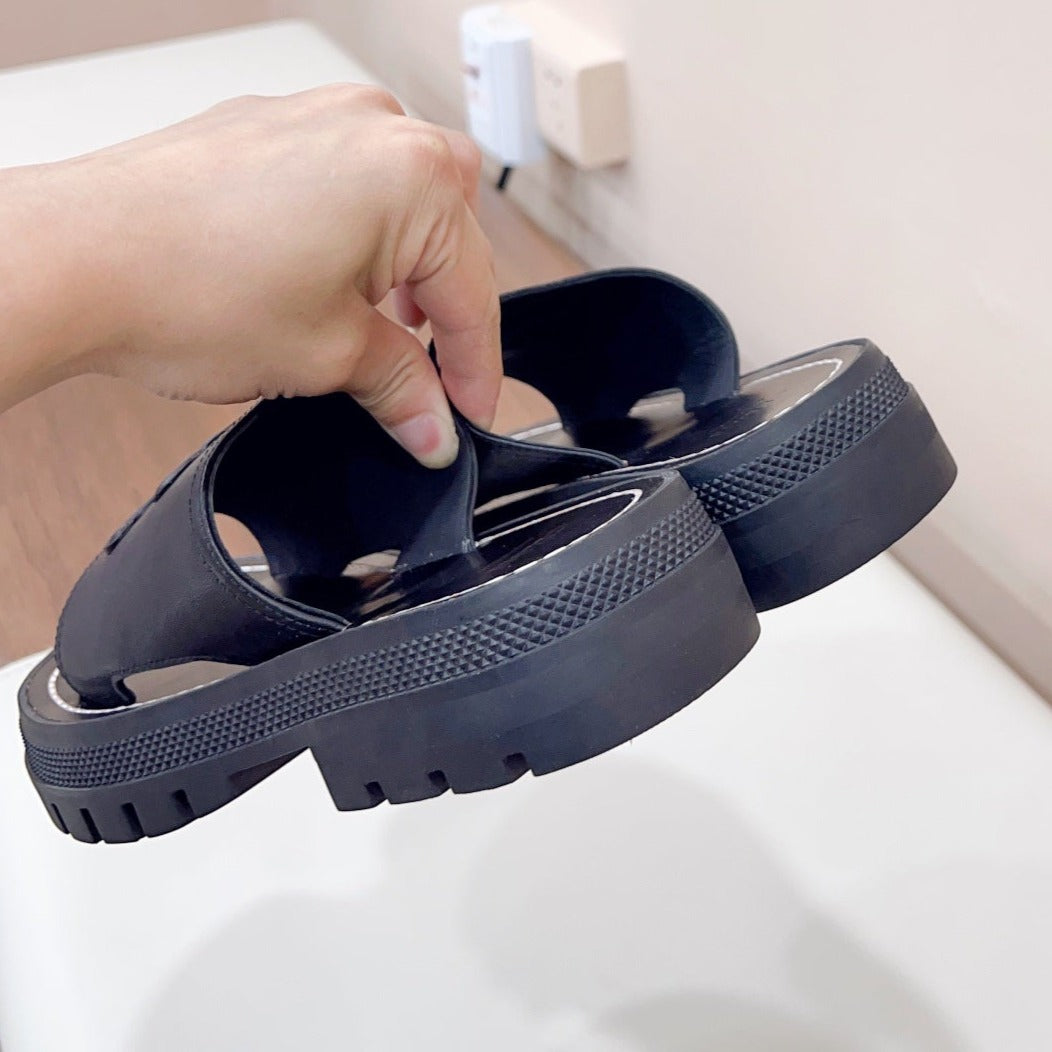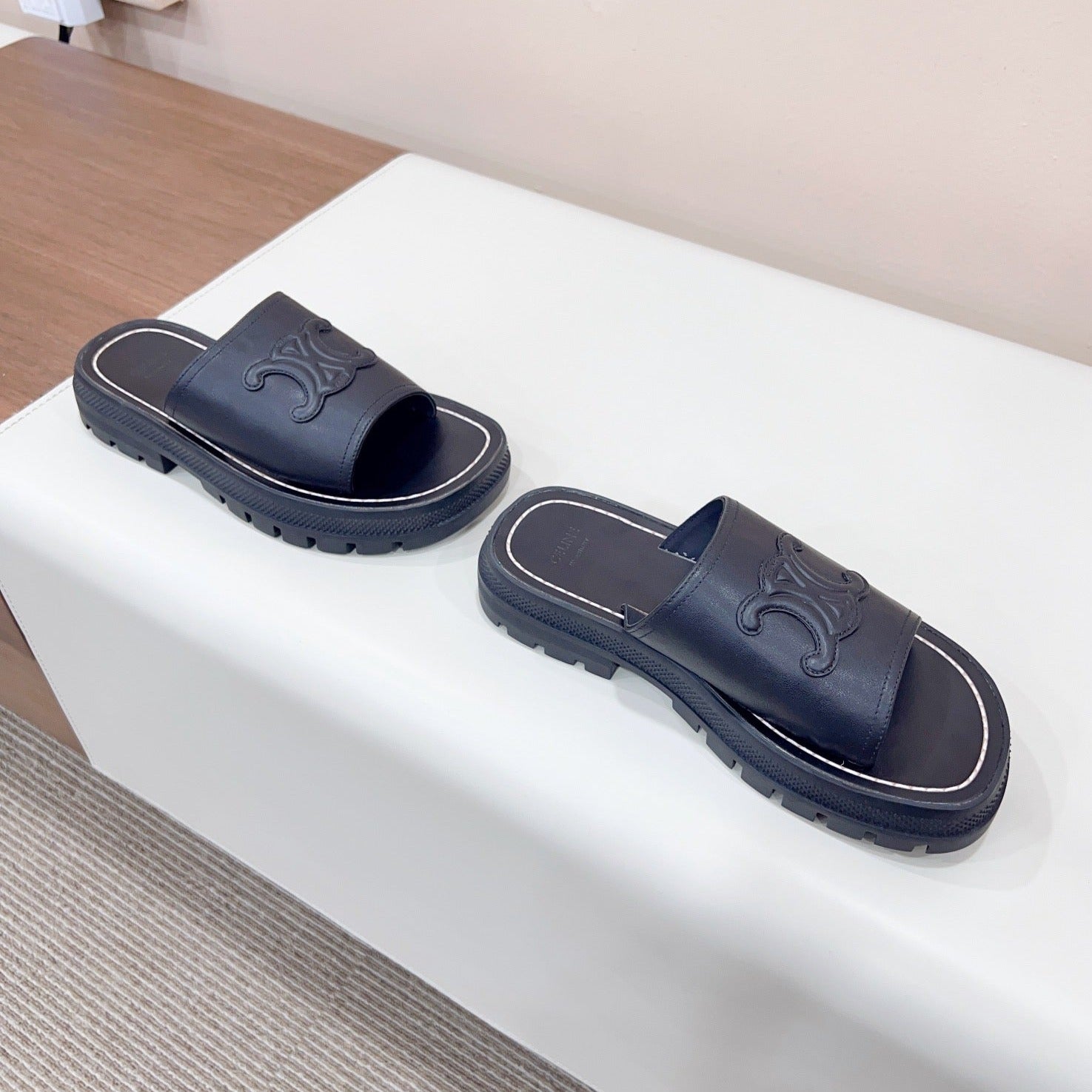 LEA TRIOMPHE PLATFORM SLIDES WOMEN VEGETABLE TANNED CALFSKIN BLACK