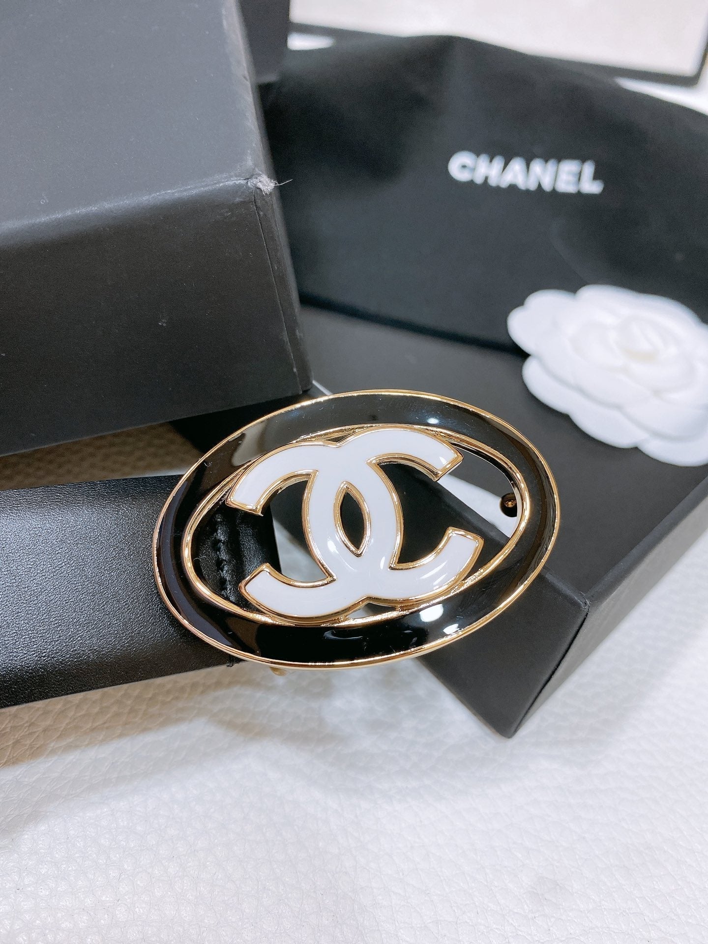CC 30MM BELT IN BLACK SMOOTH CALFSKIN WHITE MIX BLACK METAL HARDWARE