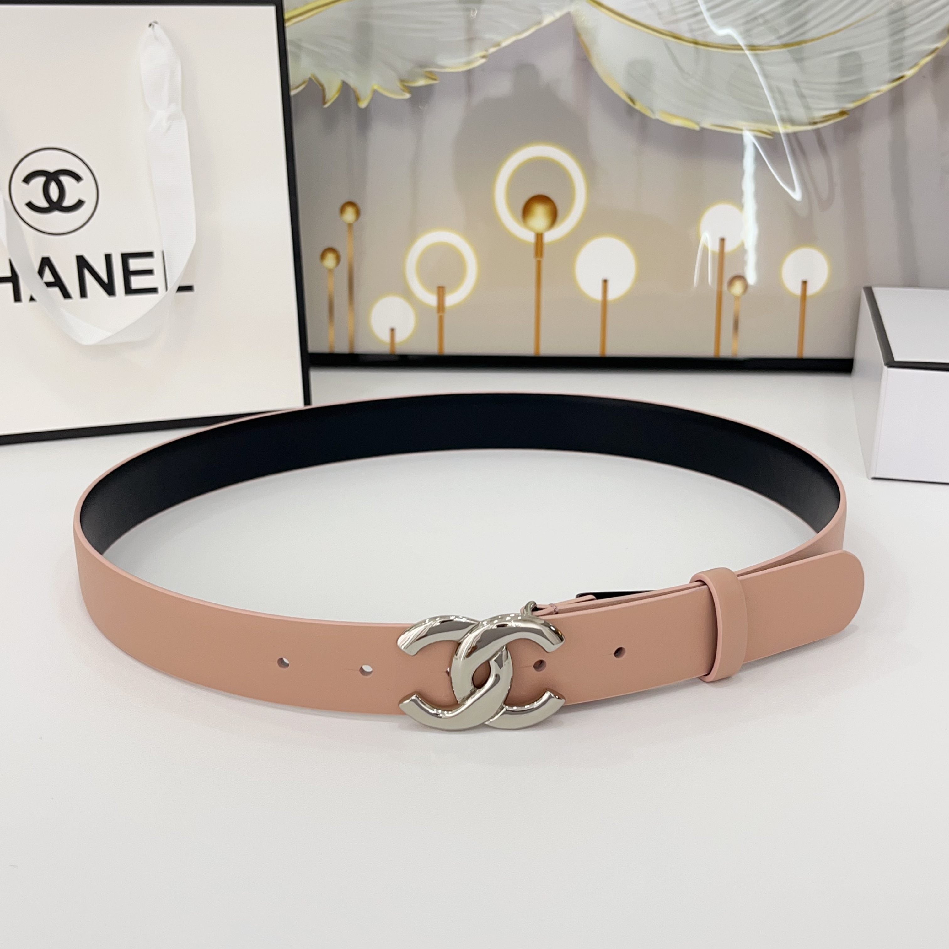 DOUBLE C BELT 30MM IN BABY PINK CALFSKIN WITH SHINY SILVER BUCKLE