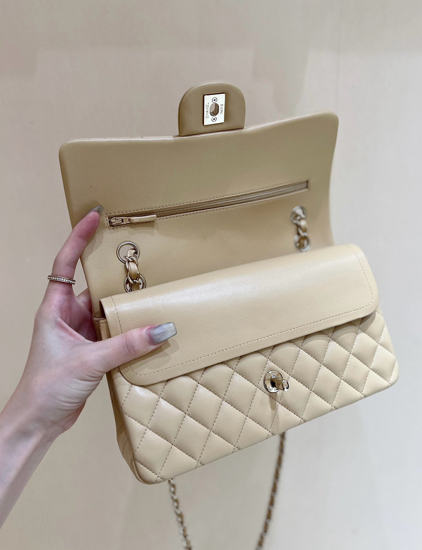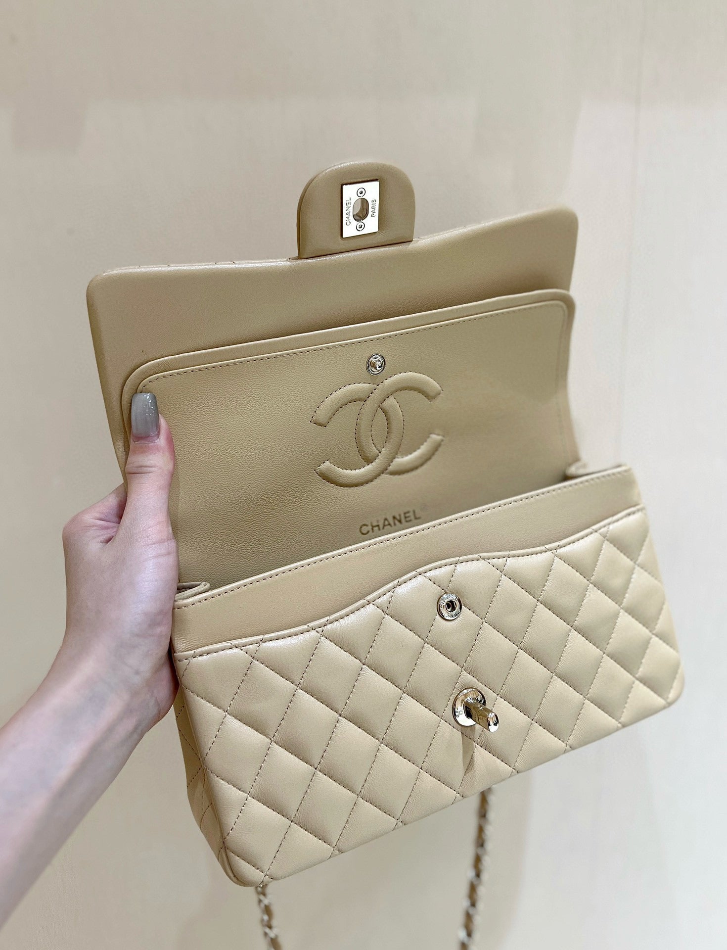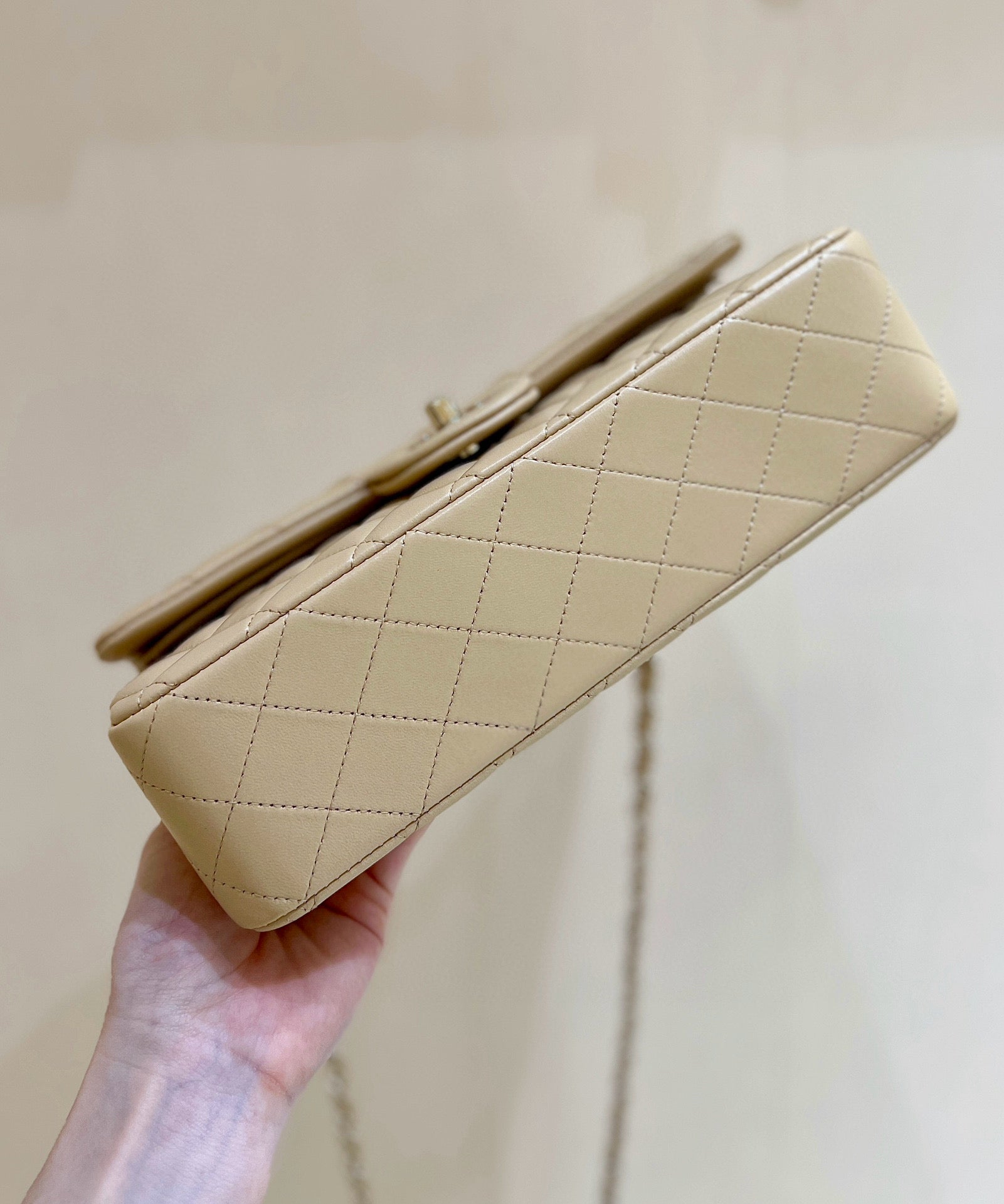 - Color: Beige, gold hardware