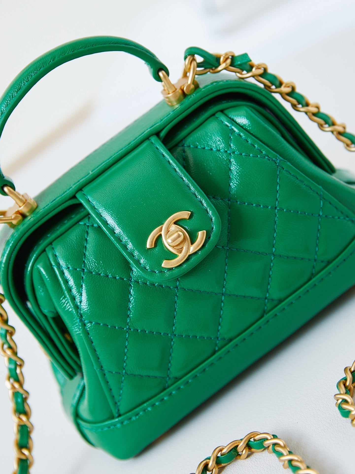 MINI TOP HANDLE BAG 13 IN GREEN OIL-WAX LAMBSKIN GOLD HARDWARE