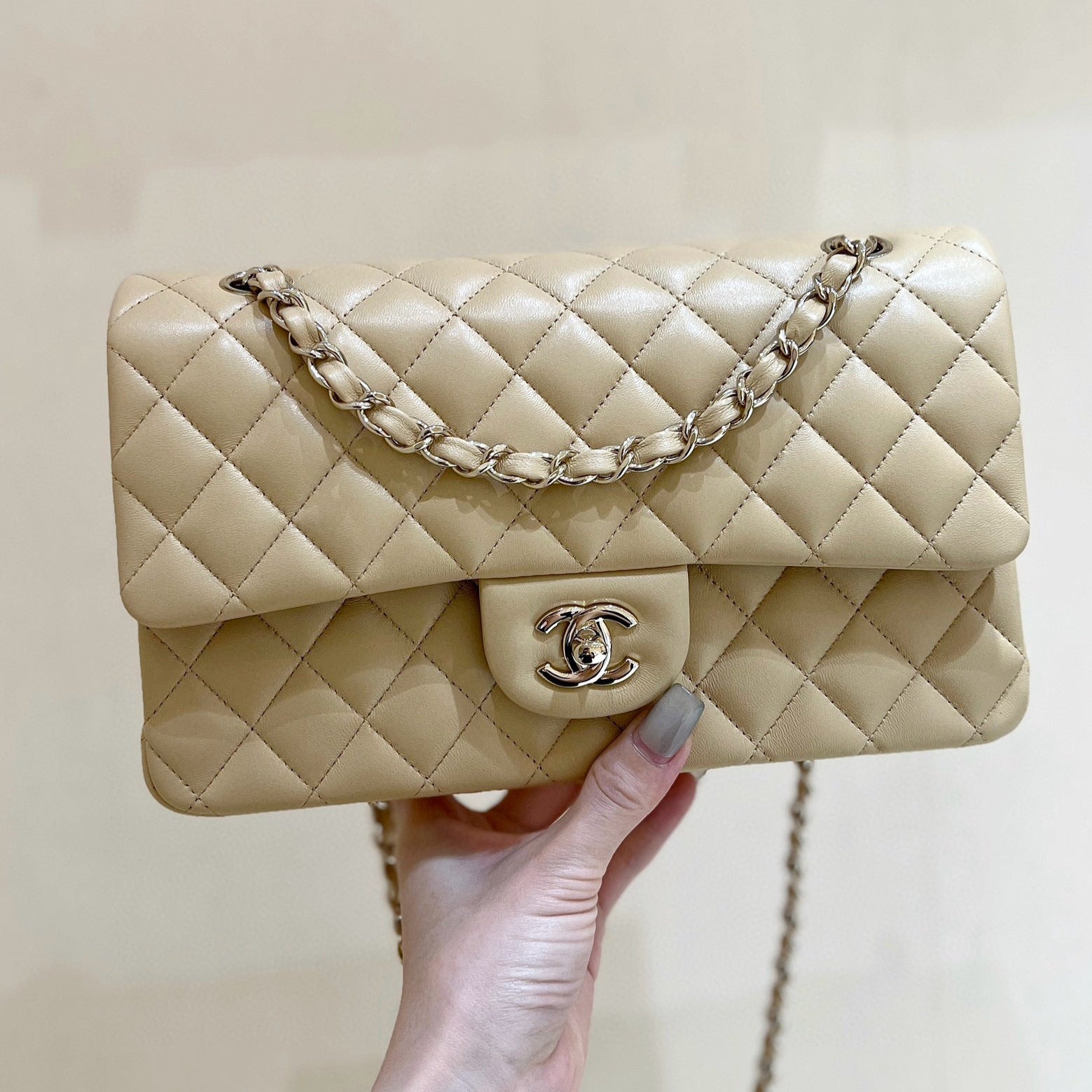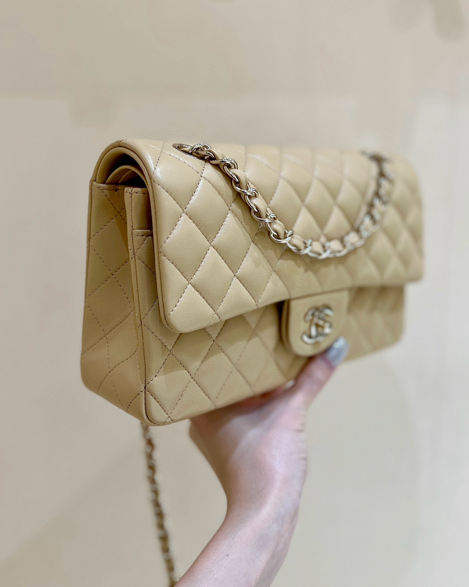 FLAP BAG 25 IN BEIGE LAMBSKIN GOLD HARDWARE