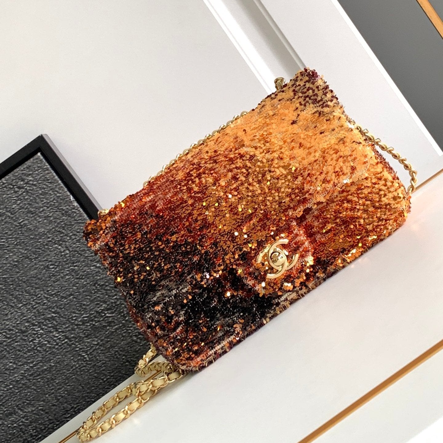 FLAP BAG 20 IN OMBRE ORANGE SEQUINS GOLD HARDWARE