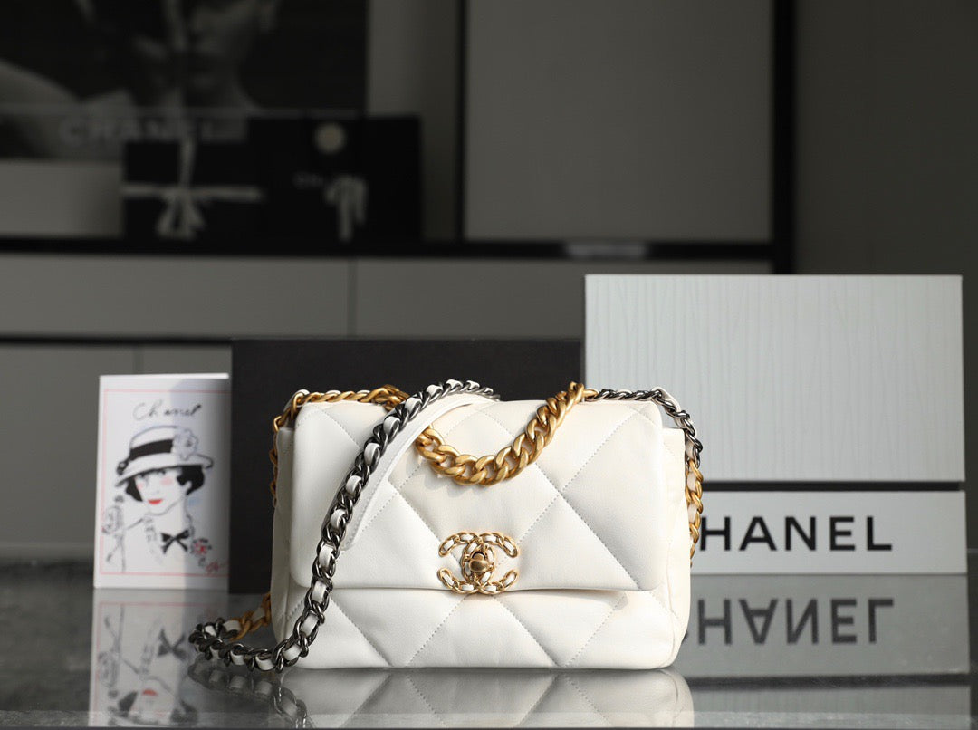 19 FLAP BAG 26 WHITE BLACK CALFSKIN