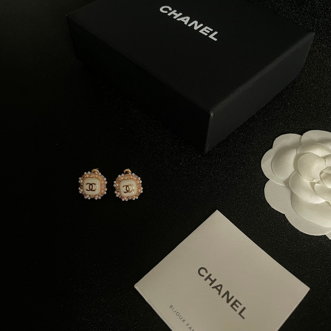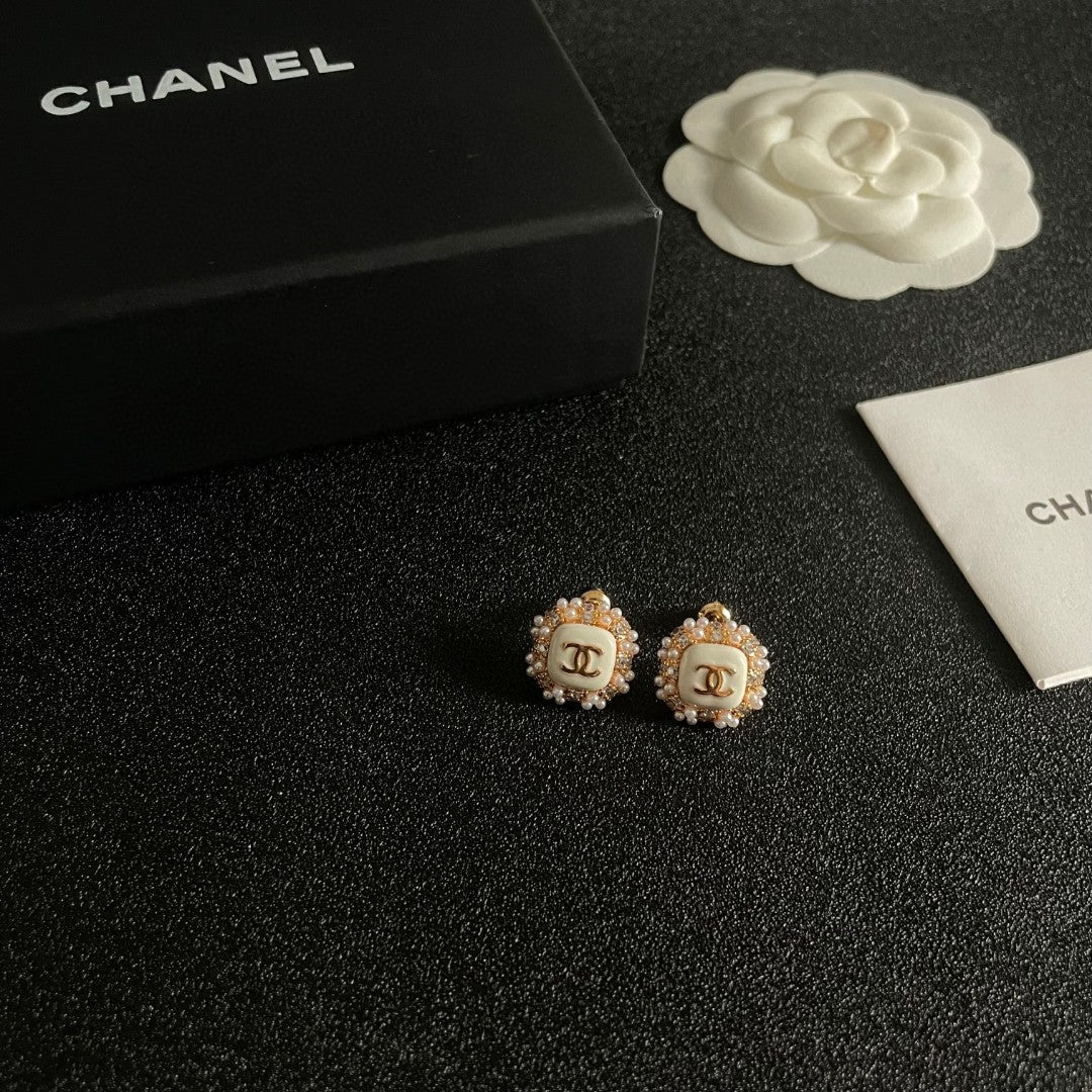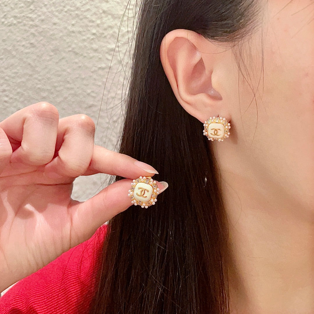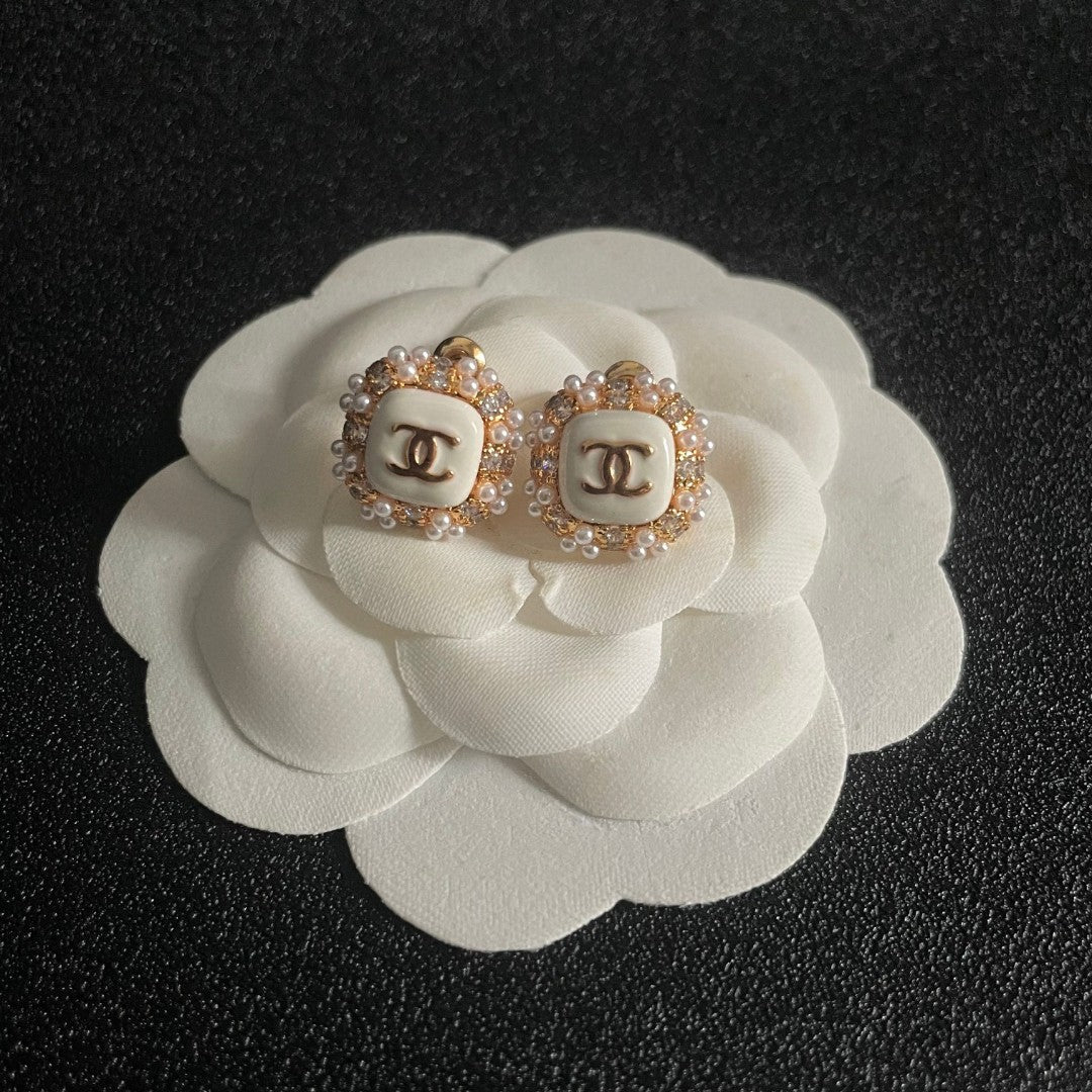 STUD EARRINGS SQUARE DOUBLE C IN GOLD METAL WHITE PEARL WHITE ENAMEL