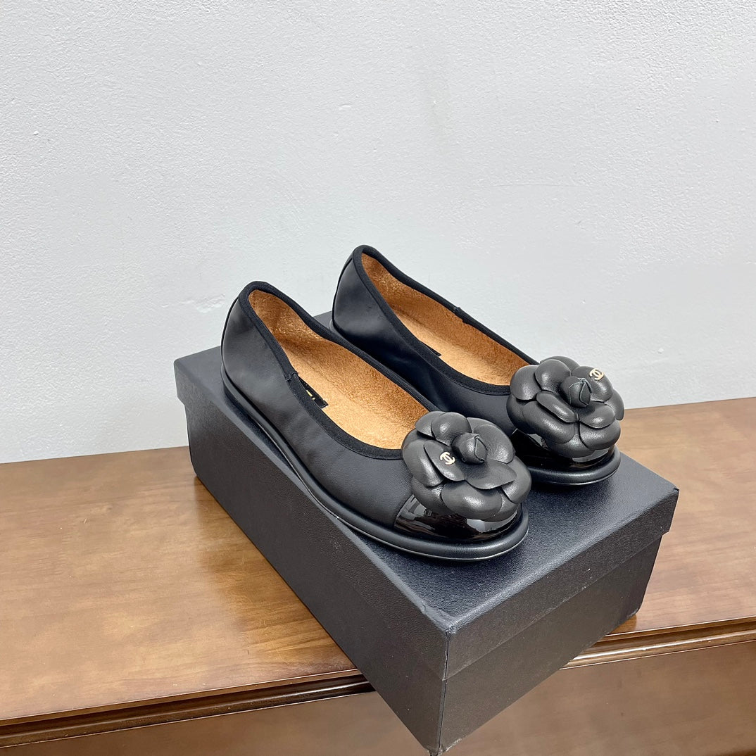 BALLET FLAT ROUND TOE IN BLACK SHEEPSKIN WITH FLOWER