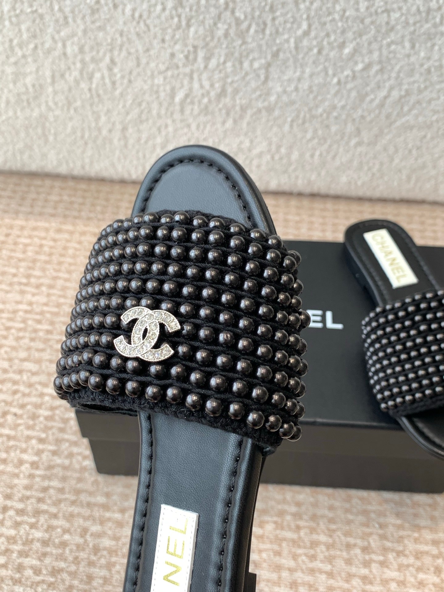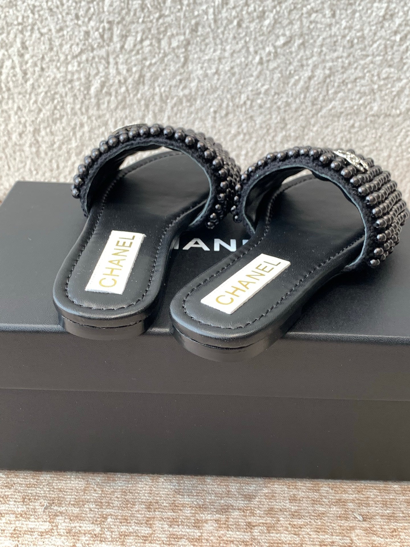 FLAT SLIDE IN BLACK LAMBSKIN WITH PEARLS