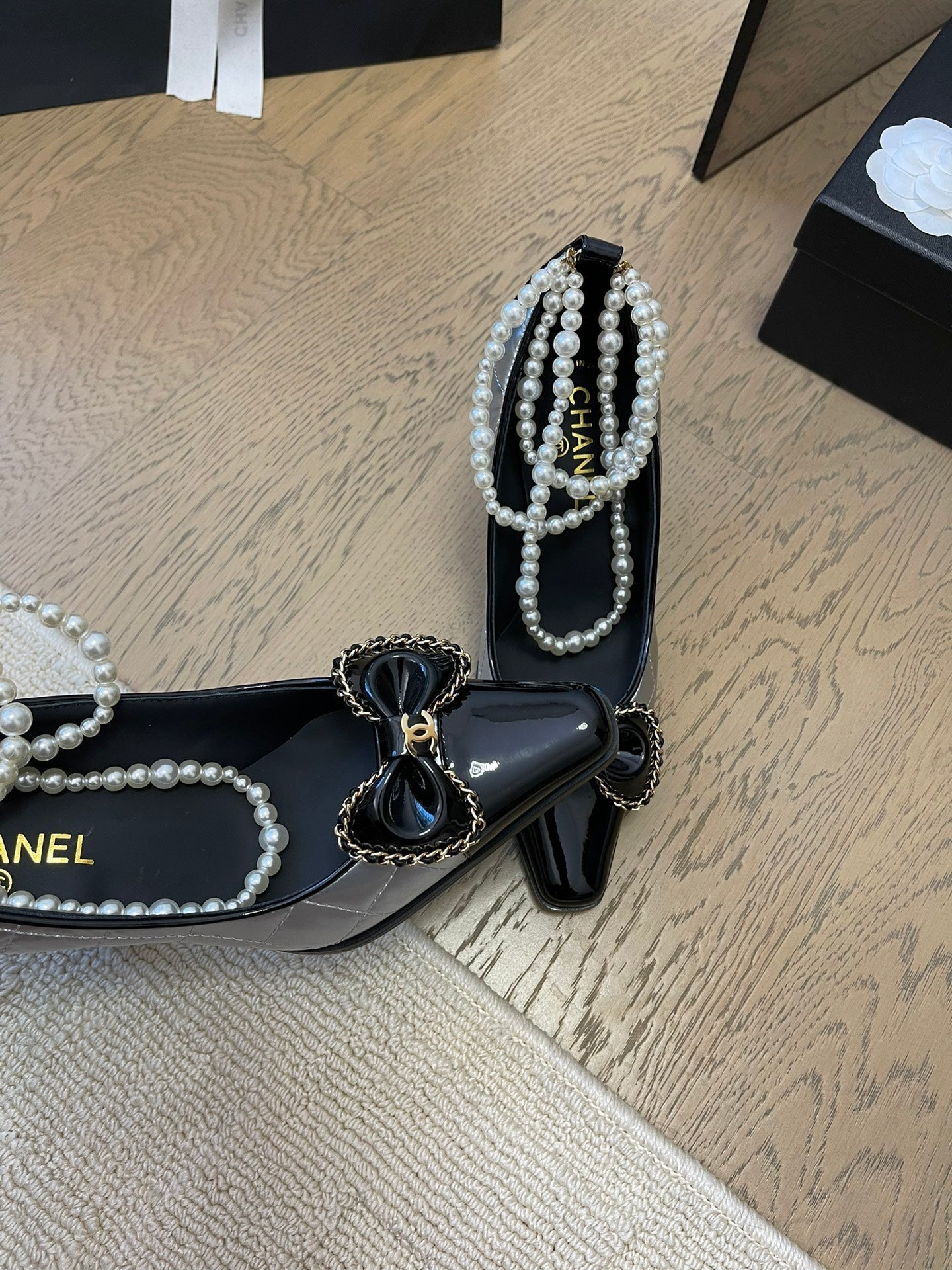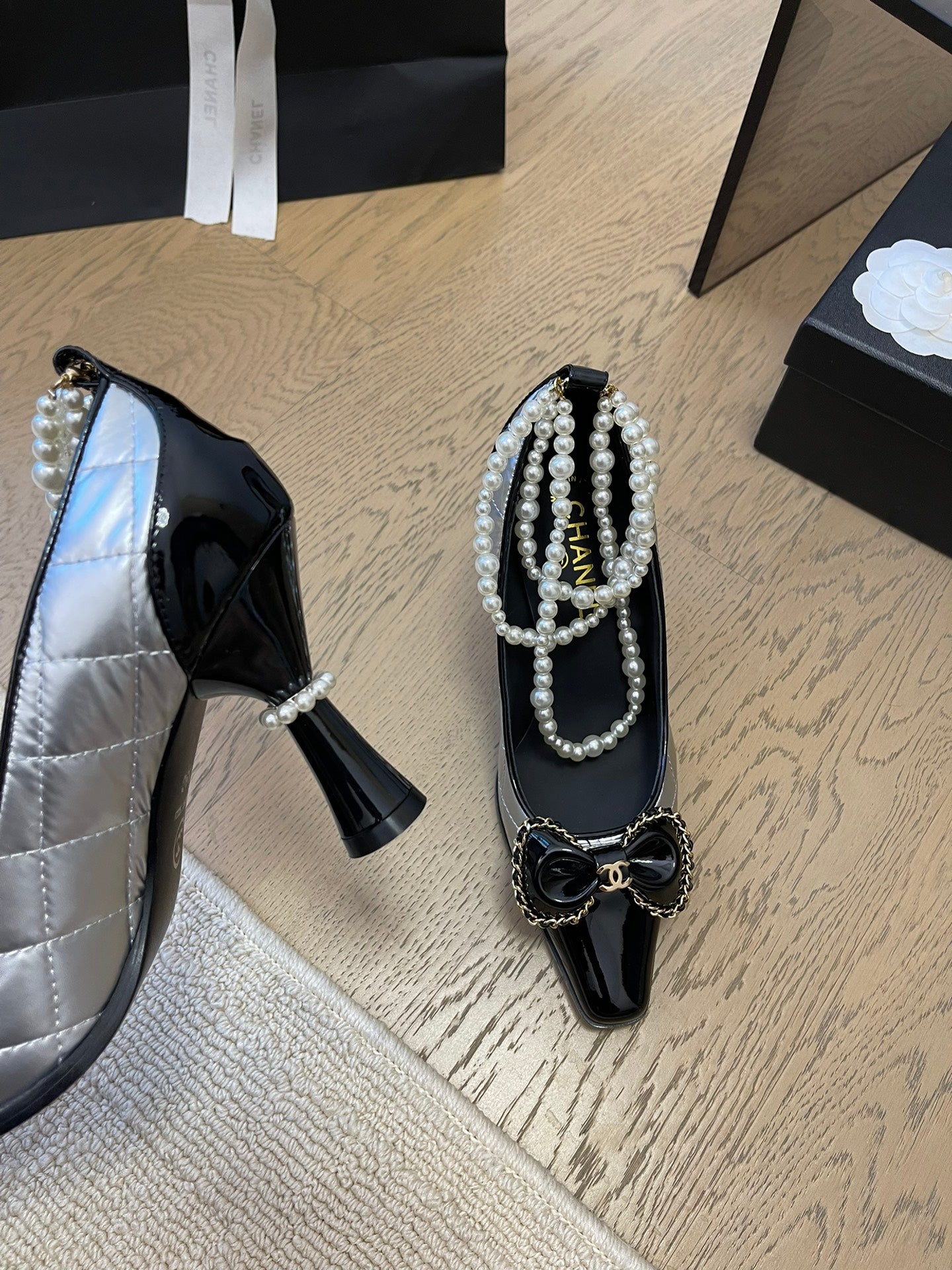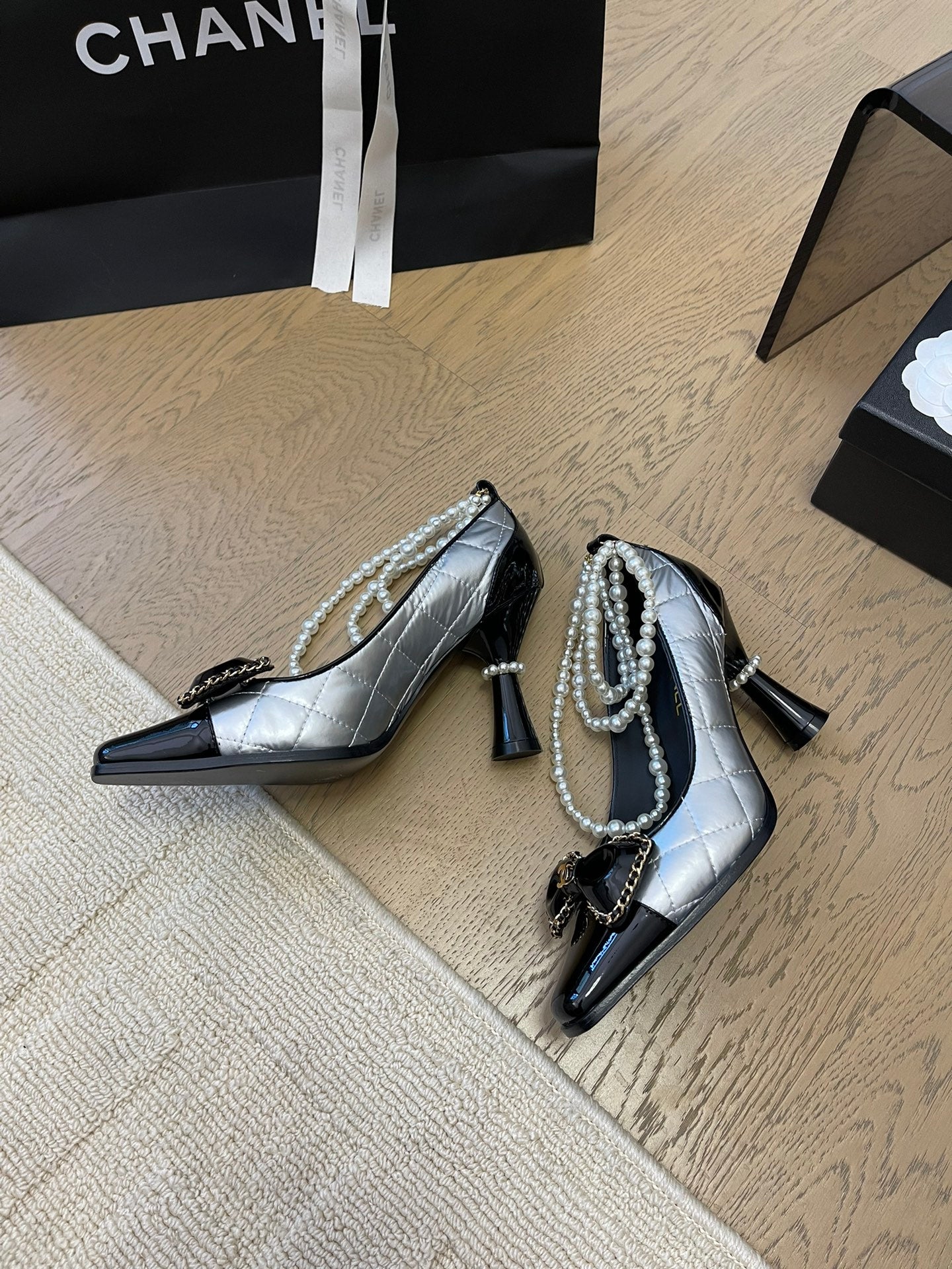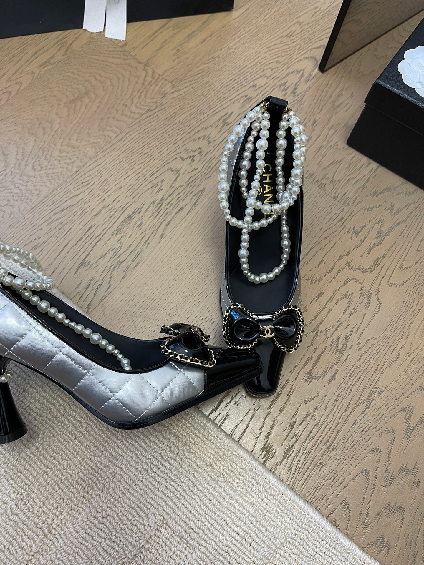 HIGH HEEL 8 CM IN SILVER MIX BLACK CALFSKIN WITH PEARL CHAIN