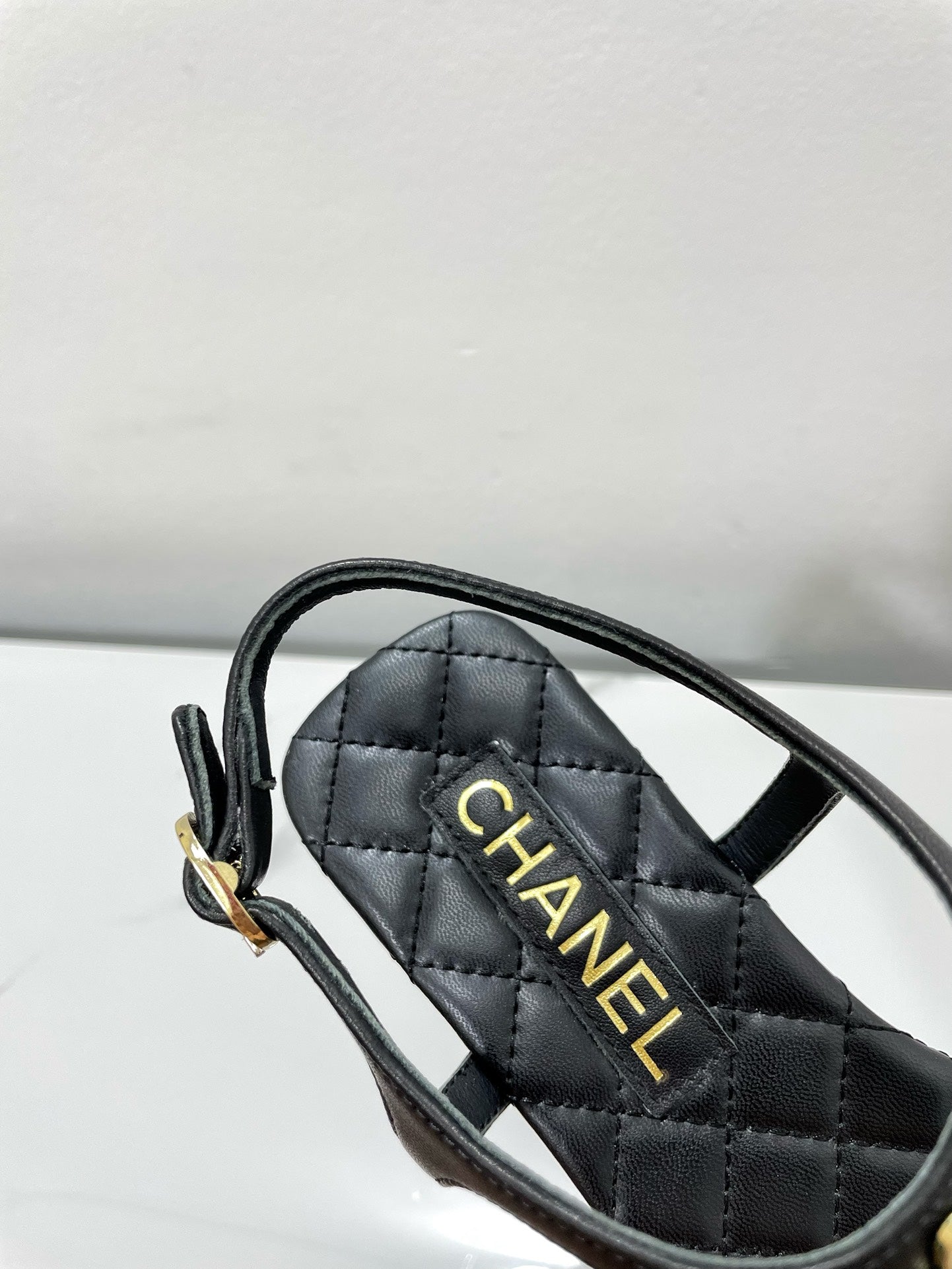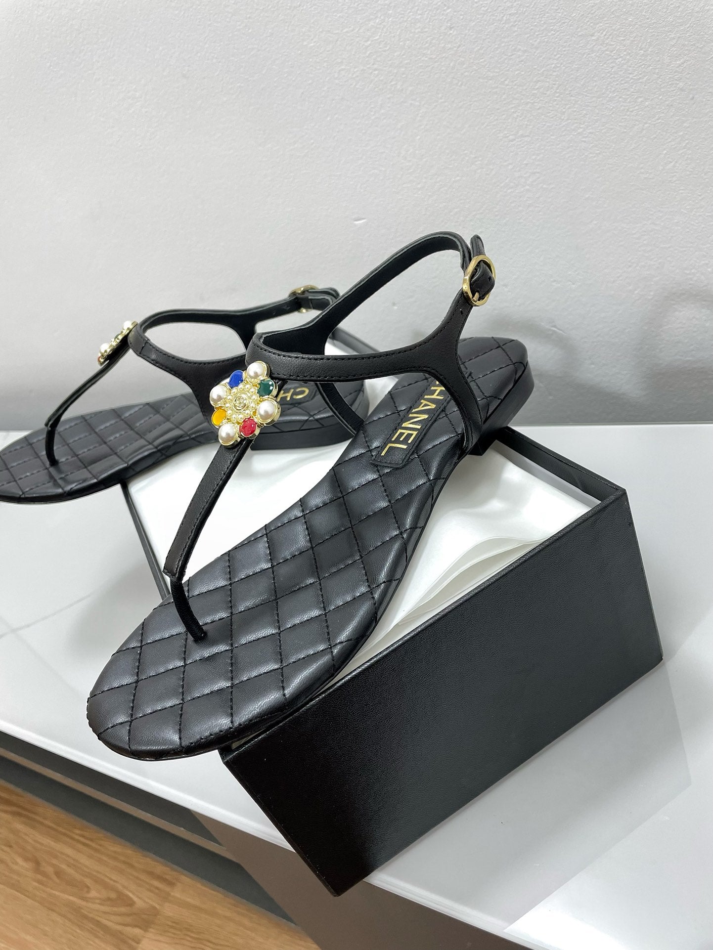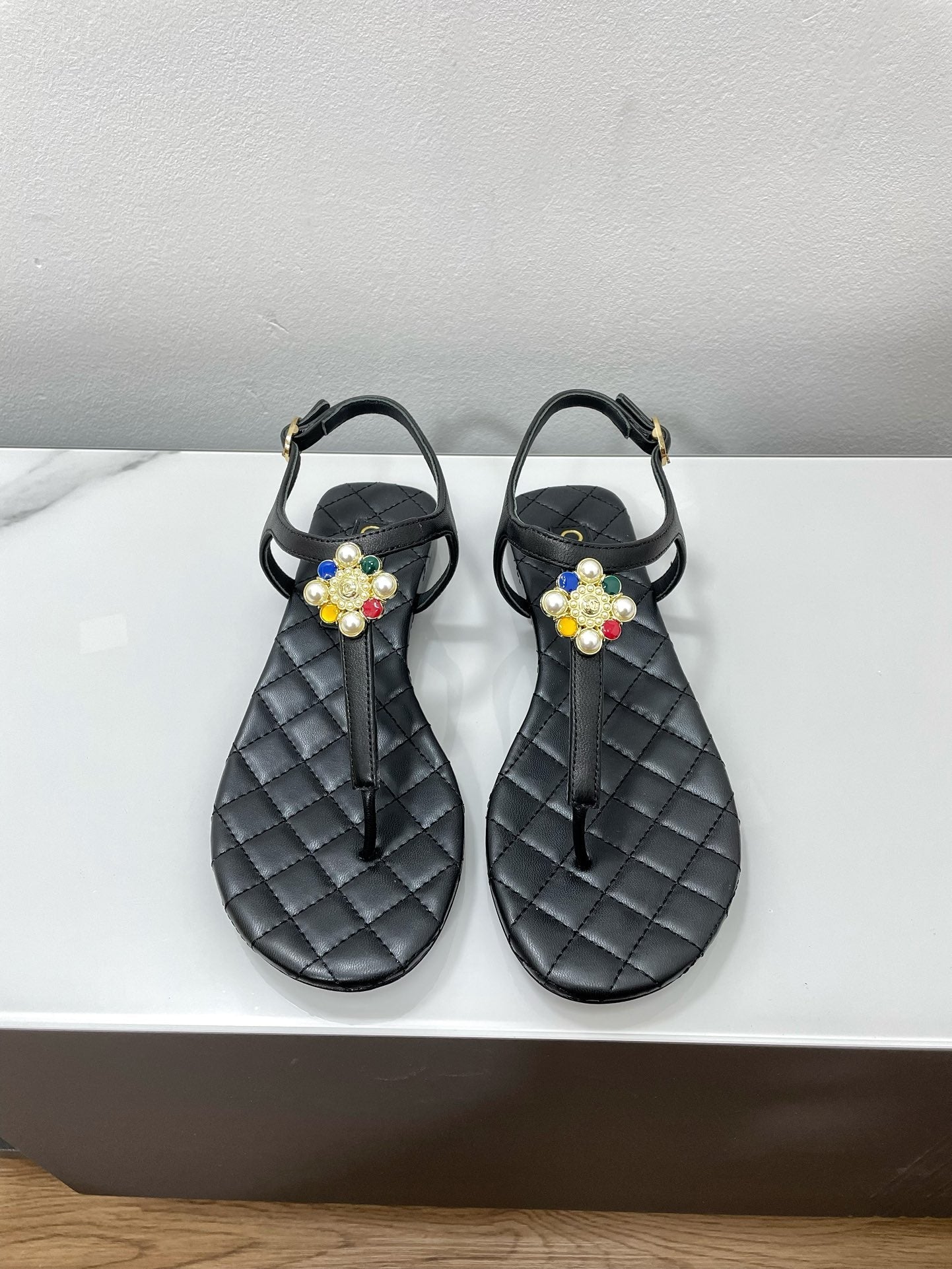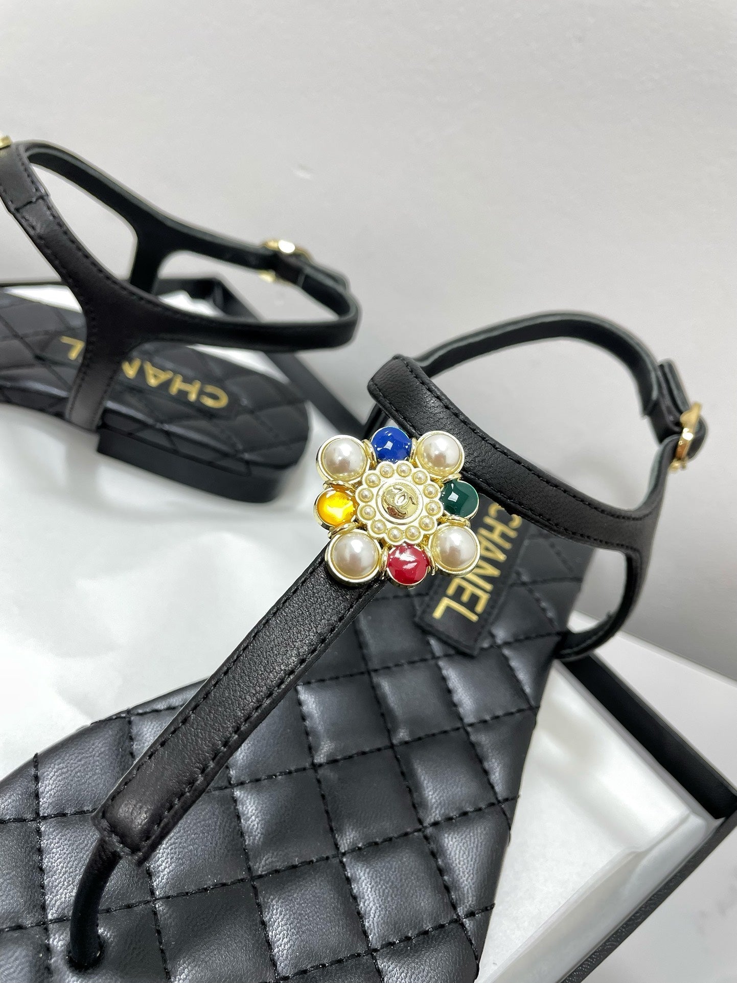 THONG SANDALS WITH COLORFUL PEARL BUCKLE IN BLACK LAMBSKIN