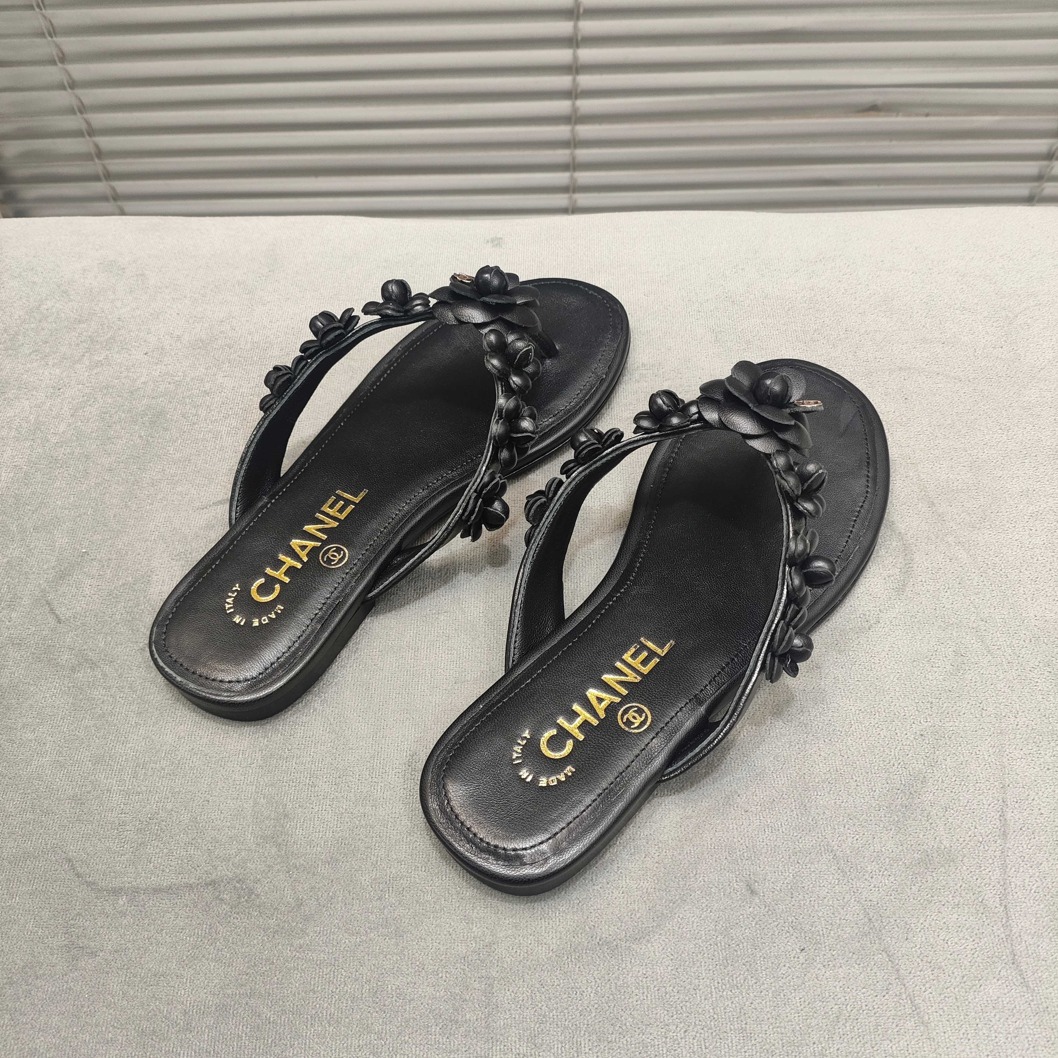 THONG SLIPPERS CAMELLIA IN BLACK SOFT LEATHER
