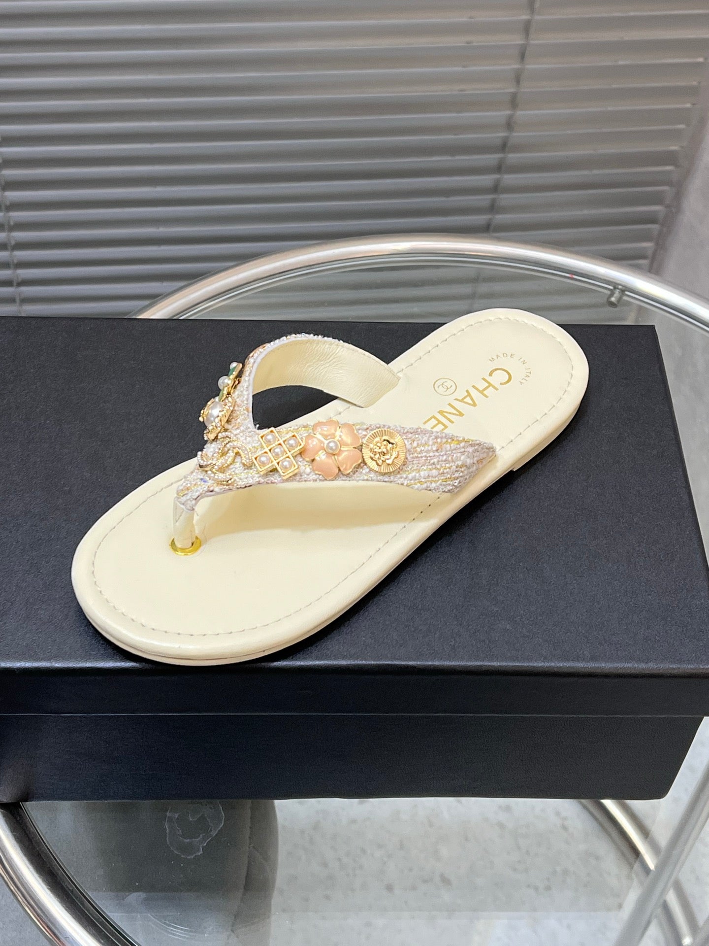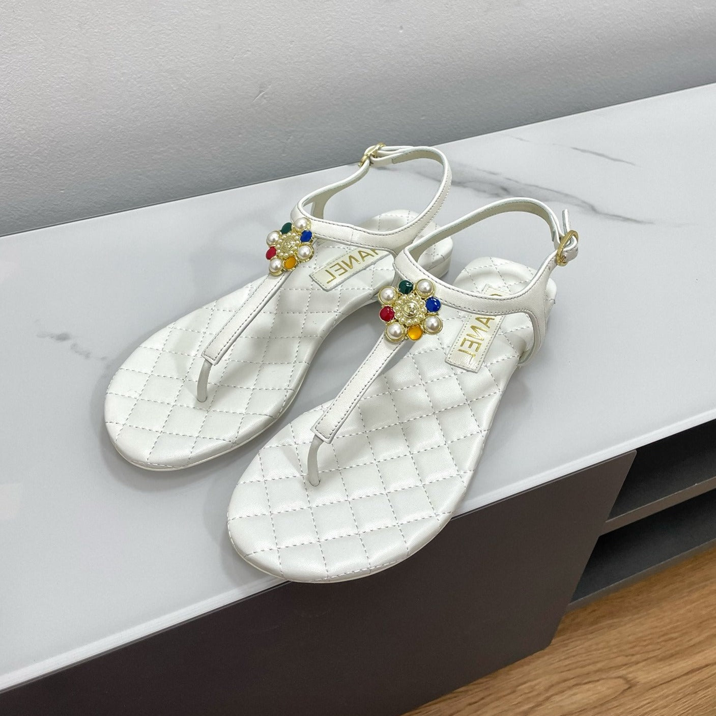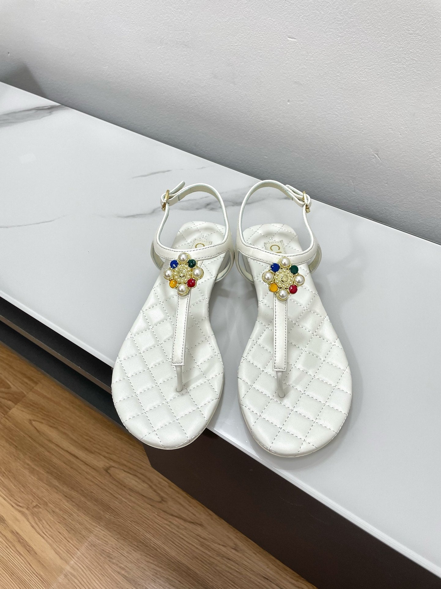 THONG SANDALS WITH COLORFUL PEARL BUCKLE IN WHITE LAMBSKIN