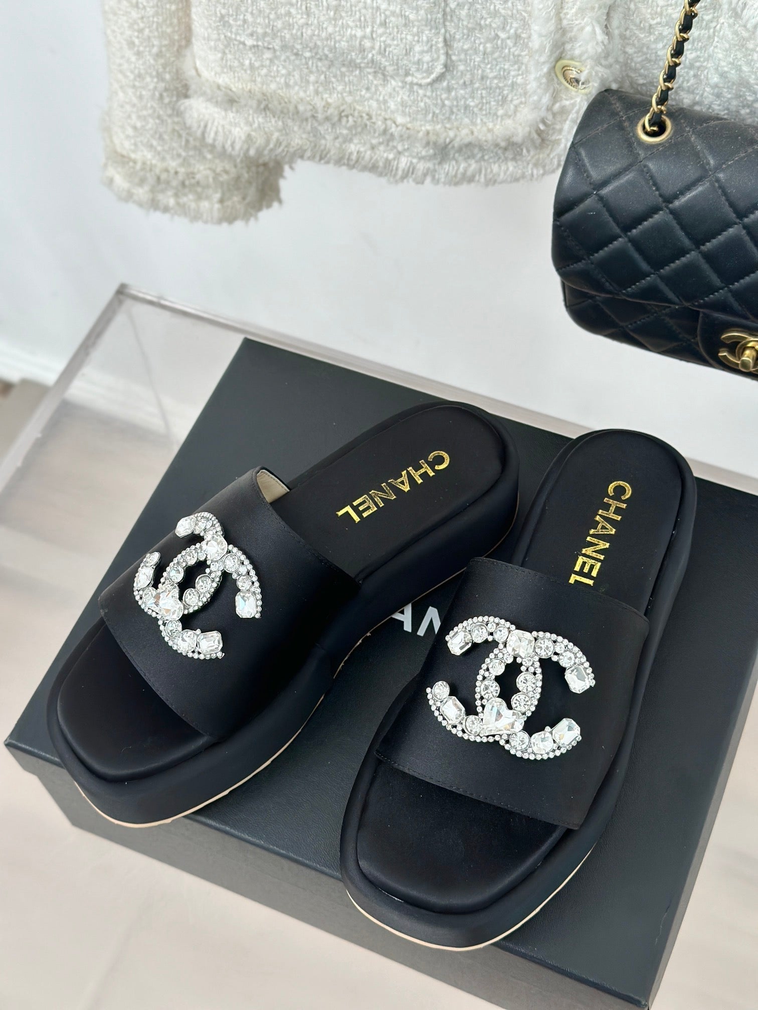 SLIPPERS THICK SOLE IN BLACK SATIN
