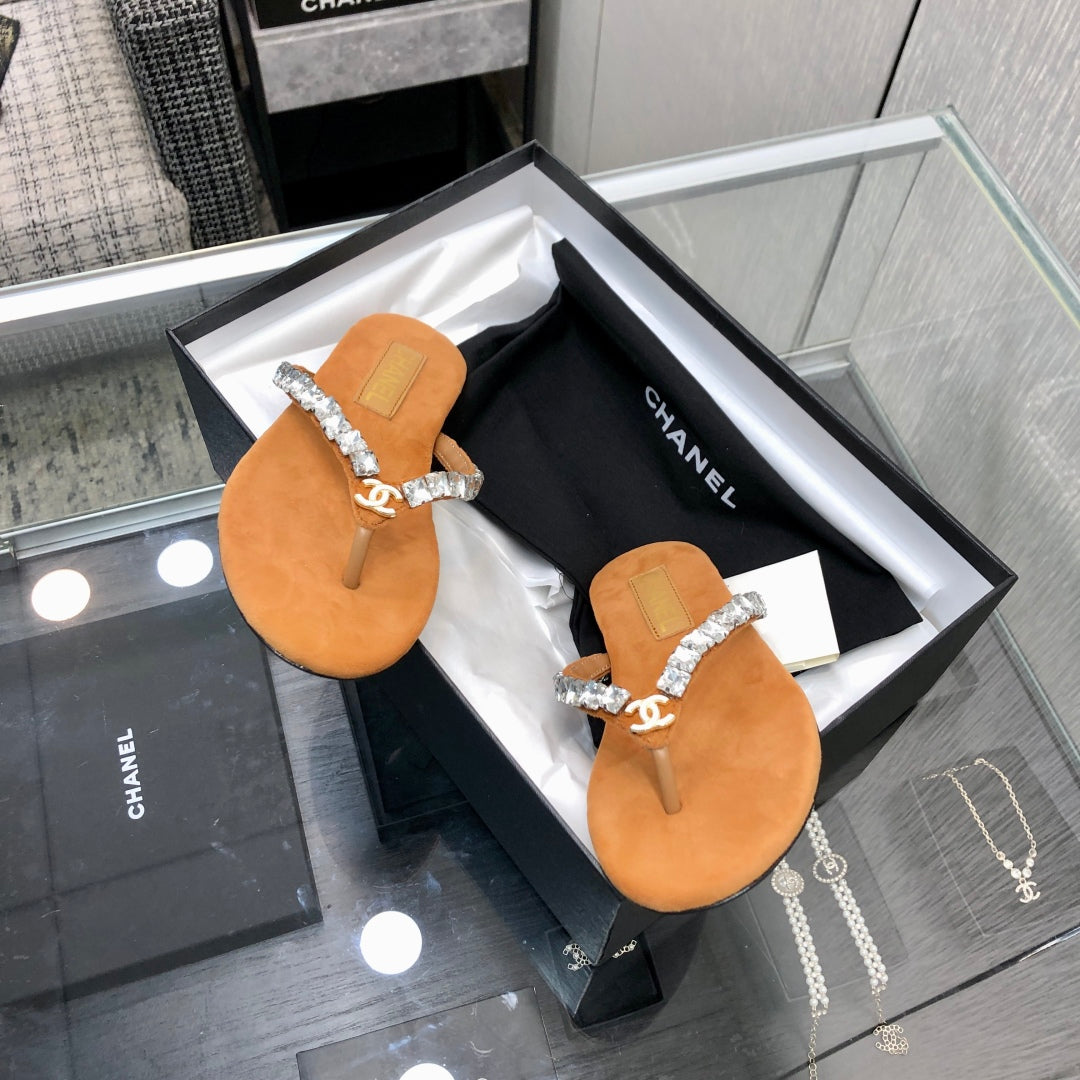 THONG SLIDE IN BRONZE BROWN SUEDE WITH WHITE CRYSTALS
