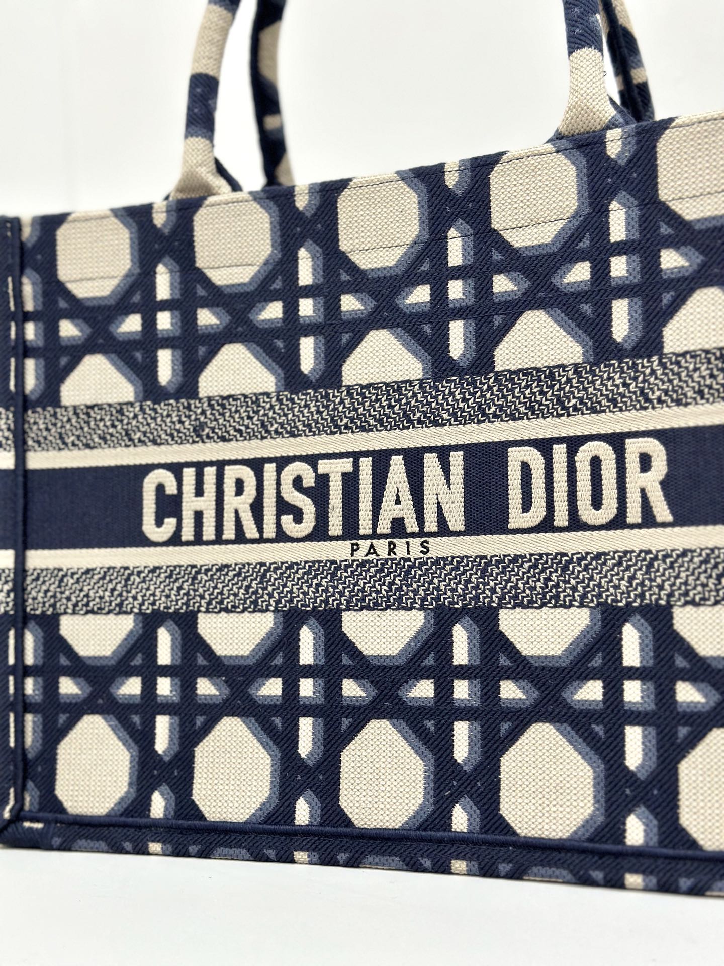 MEDIUM BOOK TOTE 37 BEIGE AND BLUE MACROCANNAGE EMBROIDERY
